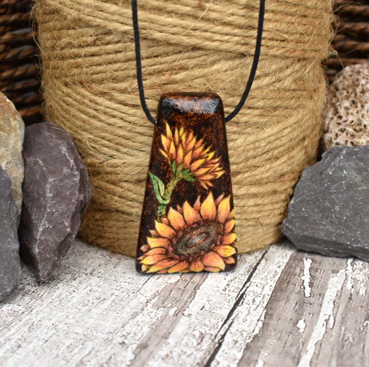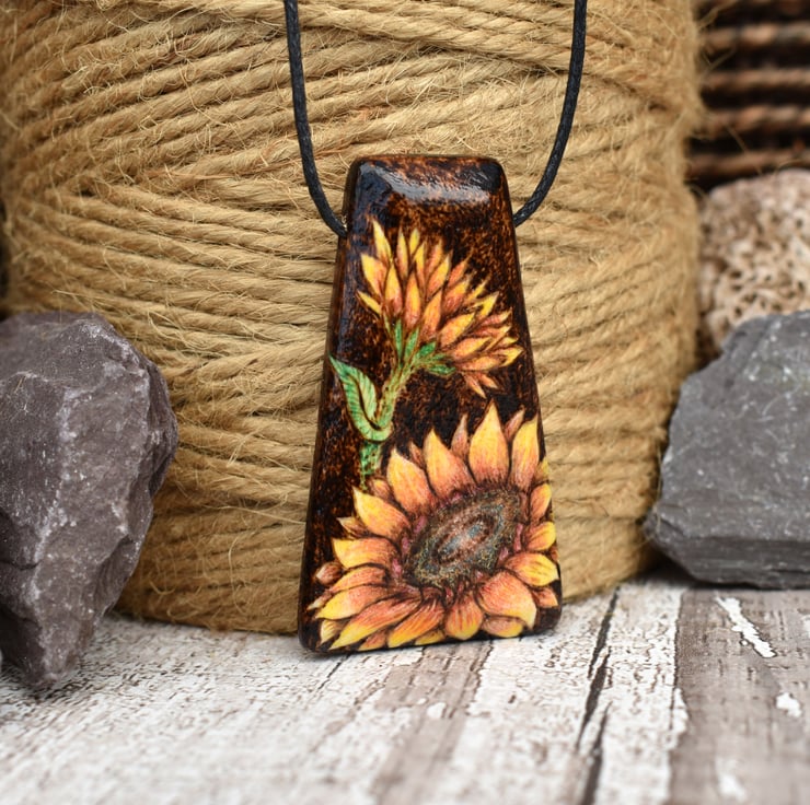 This sunny and cheerful sunflower pendant has been decorated by hand using pyrography, and coloured using prismacolor pencils in warm oranges and yellows. It features two sunflowers, against a darker background. It would make a great birthday or wood anniversary gift for a gardener maybe?