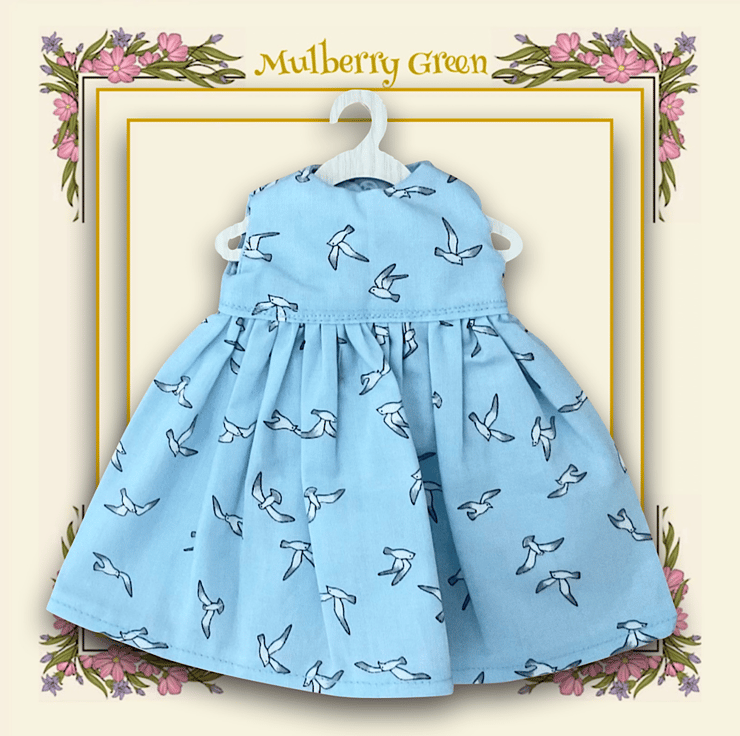 A pretty little pale blue dress, covered in little seagulls to fit the Mulberry Green characters. The dress is made from best quality cotton, has a full skirt and a lined bodice.