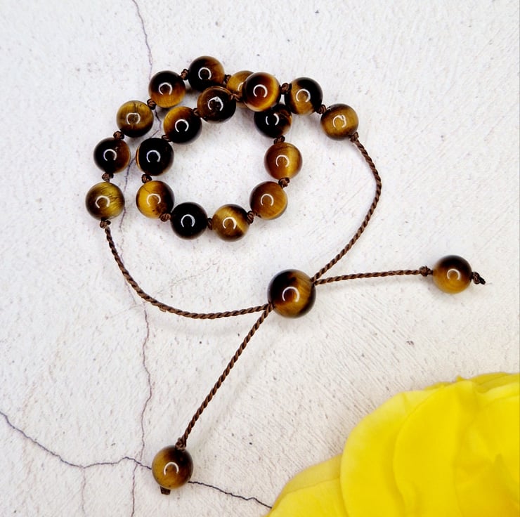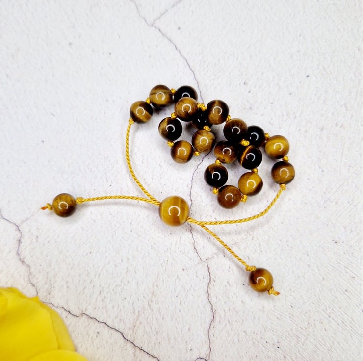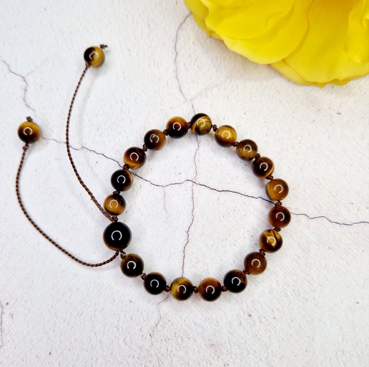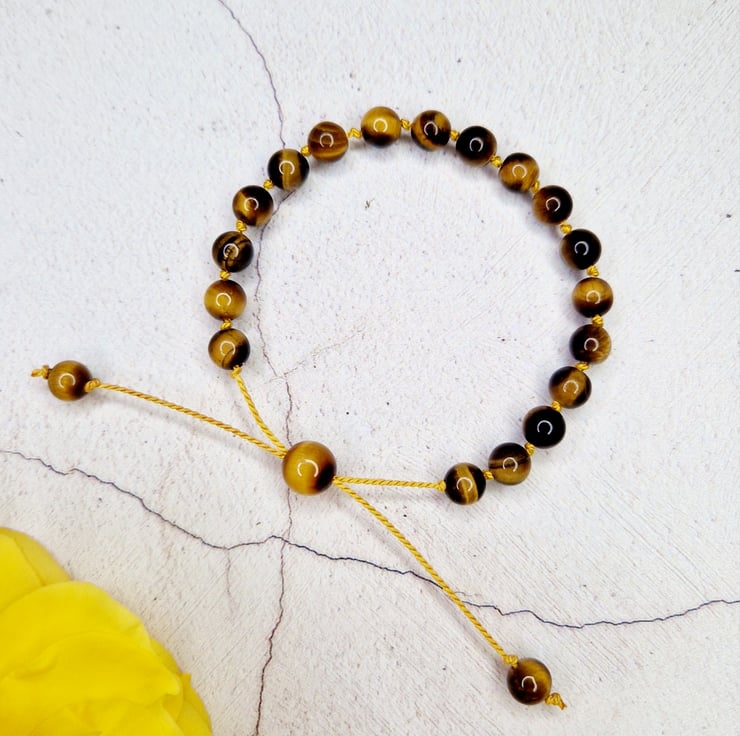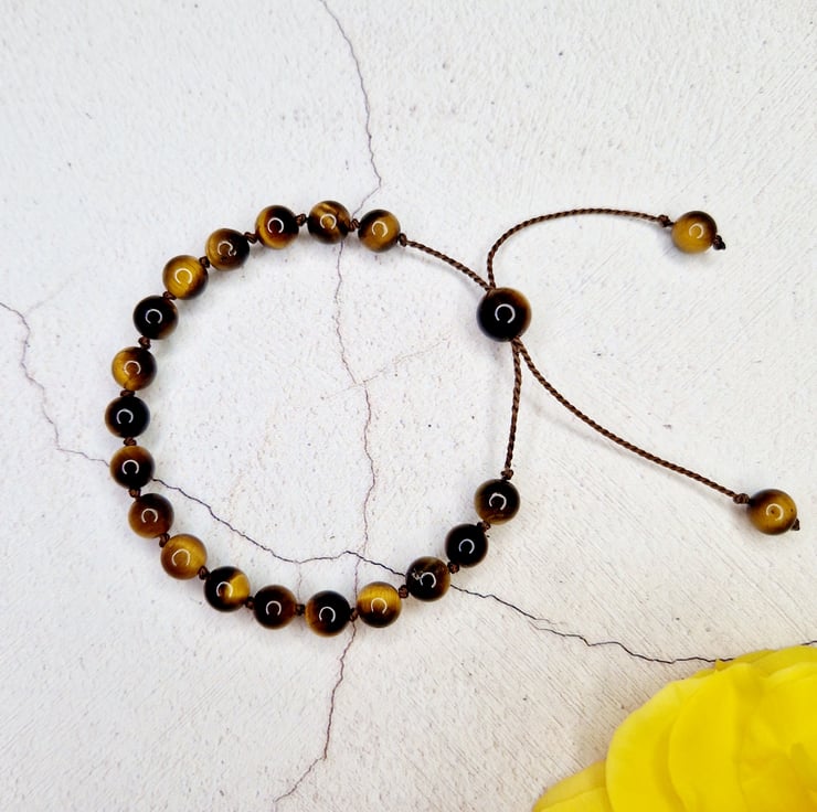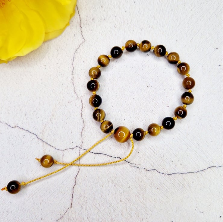 Tigers eye beads on a silk cord bracelet with a sliding bead closure.