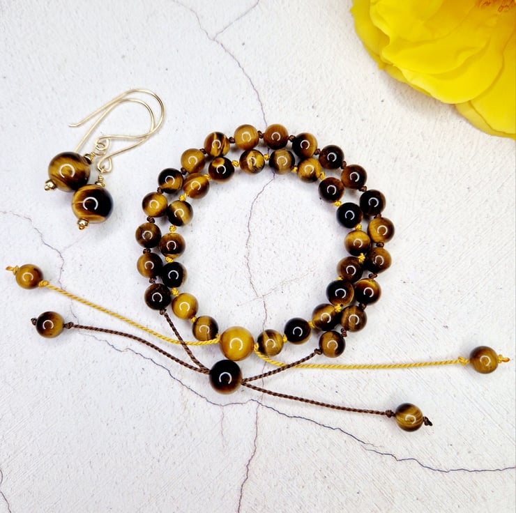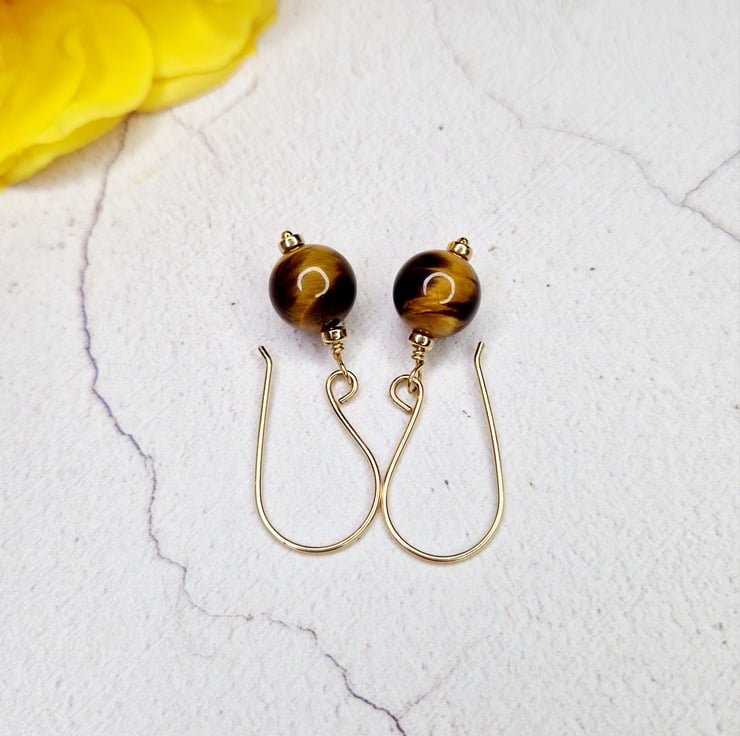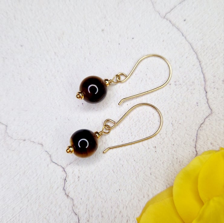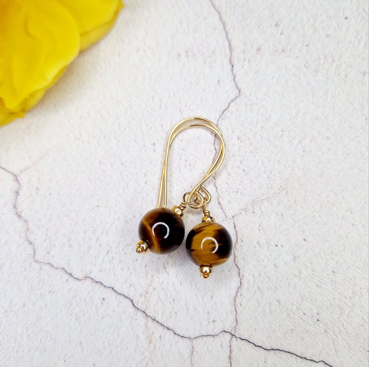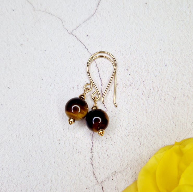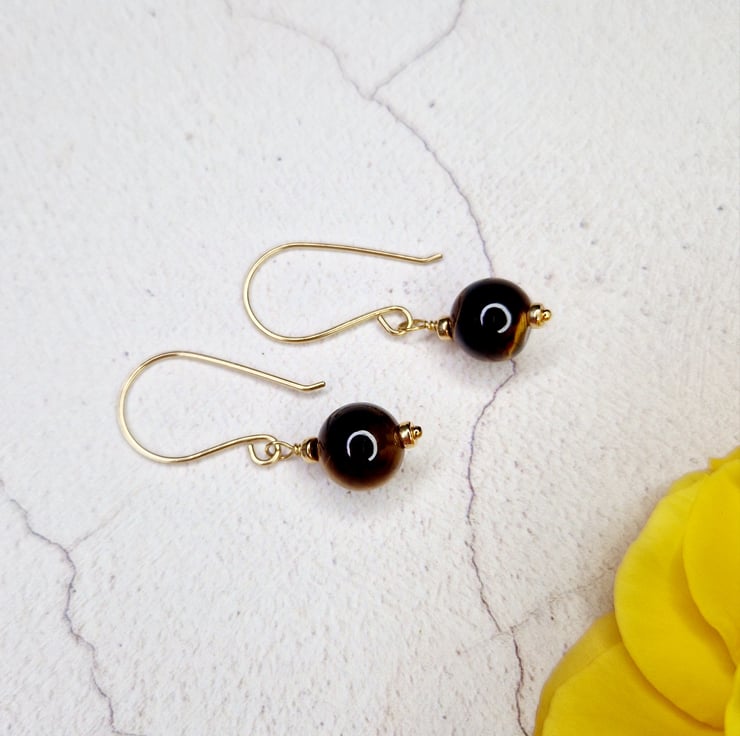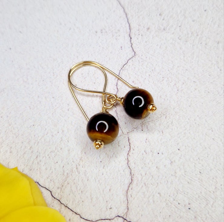 The earrings are made of single 10 mm tigers eye and 3 mm flat gold beads. The tigers eye beads have a rich brown colour with bands and of caramel and honey, all the beads have a high, even polish.