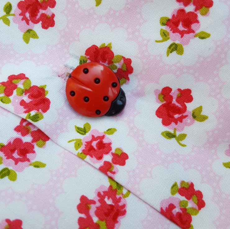 I have made this little backpack from beautiful hearts and flowers cotton fabric in pale pink with a contrasting front pocket which is fastened by a cute little ladybird button. The bag measures 27 cm wide by 36 deep And has bright red ribbon straps. Inside, the bag is fully lined with crisp pink and white gingham.