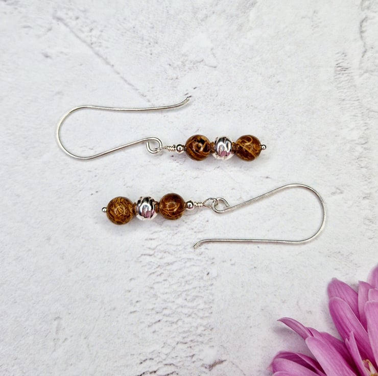 Cobra jasper and sterling silver bead earrings on handmade ear wires