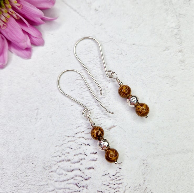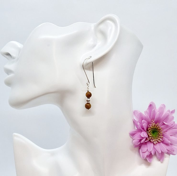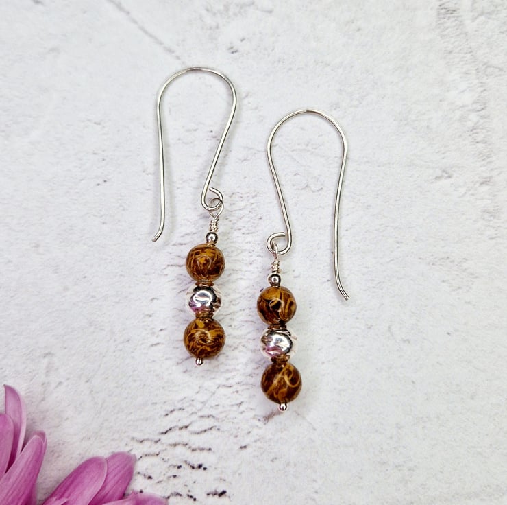Cobra jasper and sterling silver bead earrings on handmade ear wires