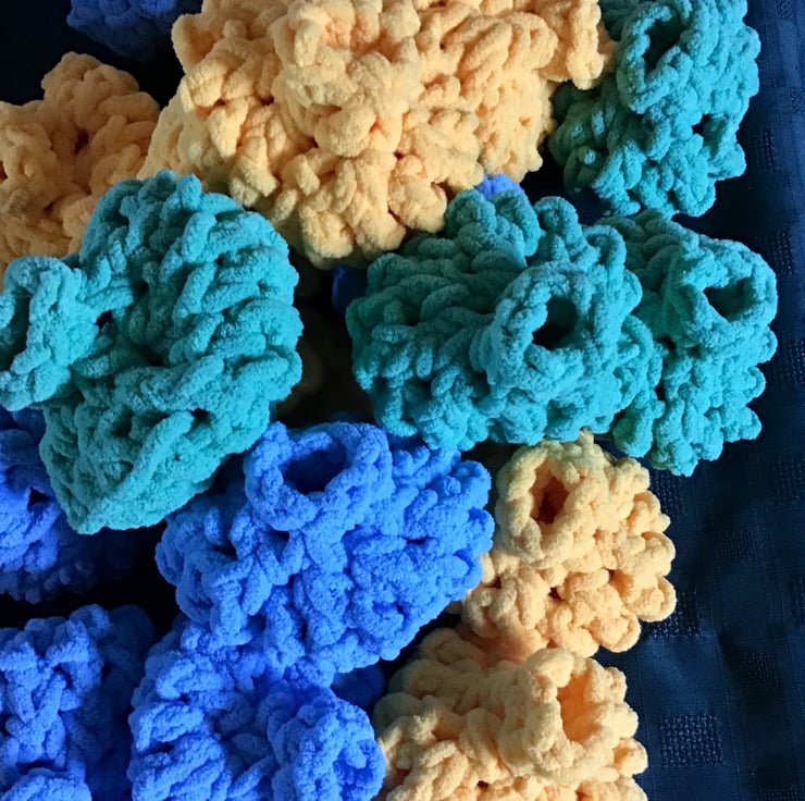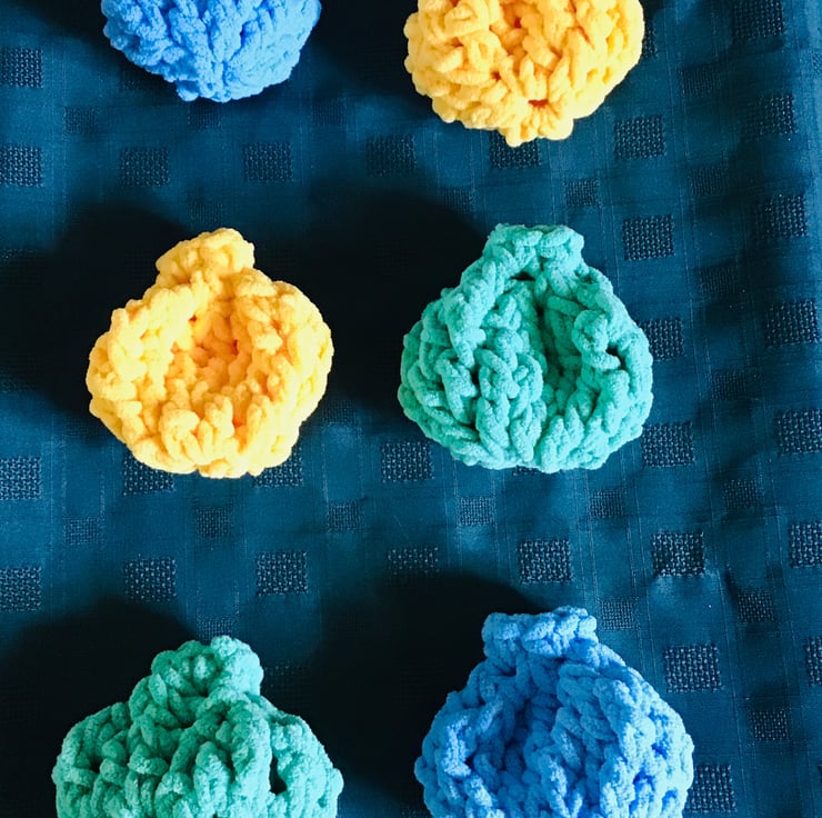 Hand crochet water bombs/ balloons. Reusable and no nasty bits to pick up afterwards. Simply dunk in cold water and take aim. Great fun for the hot weather. 100% polyester yarn. Can be put in the washing machine. One of each colour - Yellow Green Blue