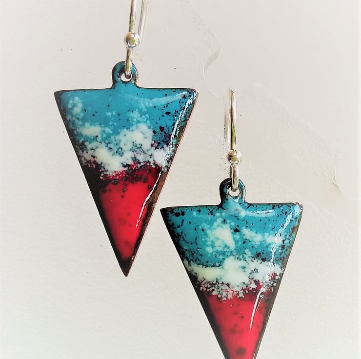 A pair of beautiful triangle copper earrings in shades of teal, red and white enamel. The earrings have been kiln-fired and each measures 24mm from top to tip and 17mm across the widest part, and come complete with sterling silver earring wires. The backs have been given a light silver plating to give a polished effect. They are supplied with a little organza pouch and POSTAGE IS FREE!