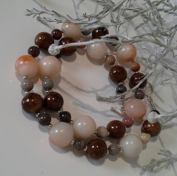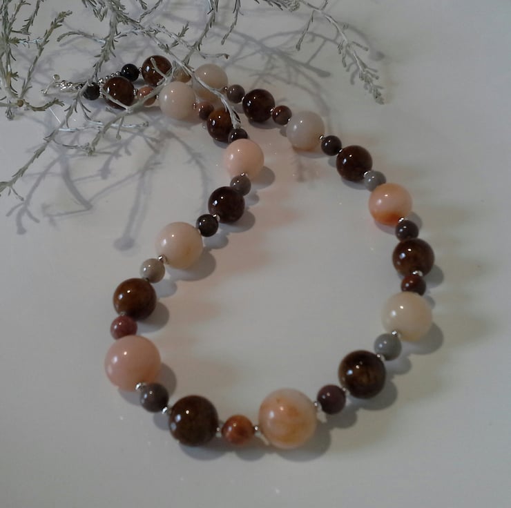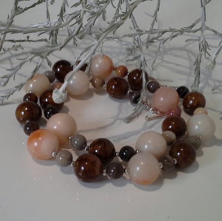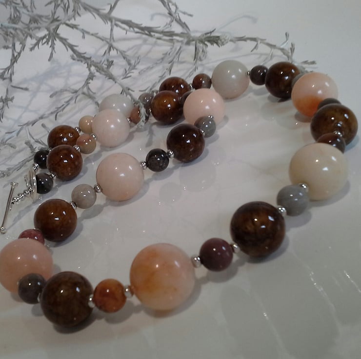 A lovely statement necklace ideal for autmn and winter to accessories a ladies wardrobe collection, worn with a scarf and their favorite winter woollies. The 14mm bronzite rounds have an exceptionally high polish, showing of the warm brown colours. To compliment them a have used watermelon colour larger 20mm round agate gemstones with soft tones of cream and orange hues within them. To add further appeal smaller 8mm agate rounds provide more natural colours of autumn. Between the gemstone rounds are quality silver plated rondelle shaped spacers adding a touch of sparkle and opulence.