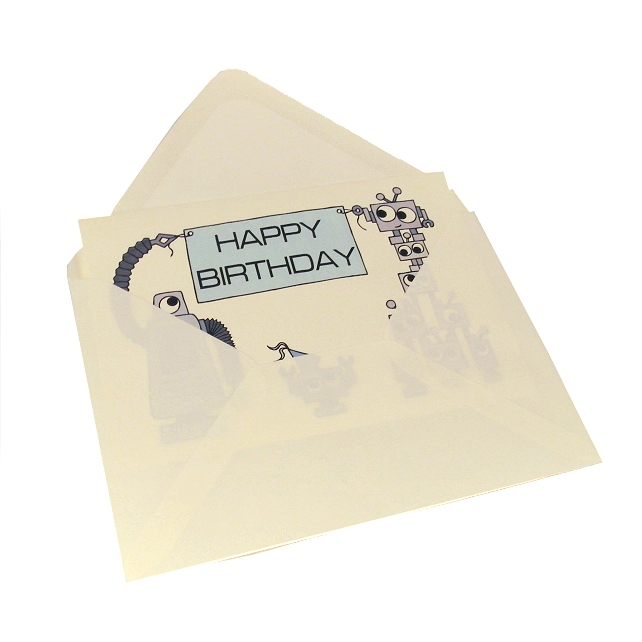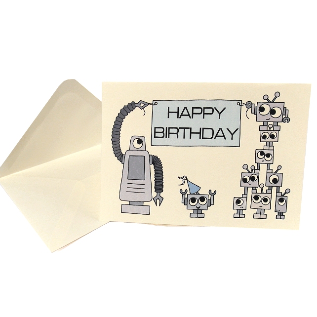 This original cute robot design by Kim Onyskiw is printed on an A6 (105mm x 148mm) ivory card, and comes with an ivory envelope. The inside of the card is blank for your own message.