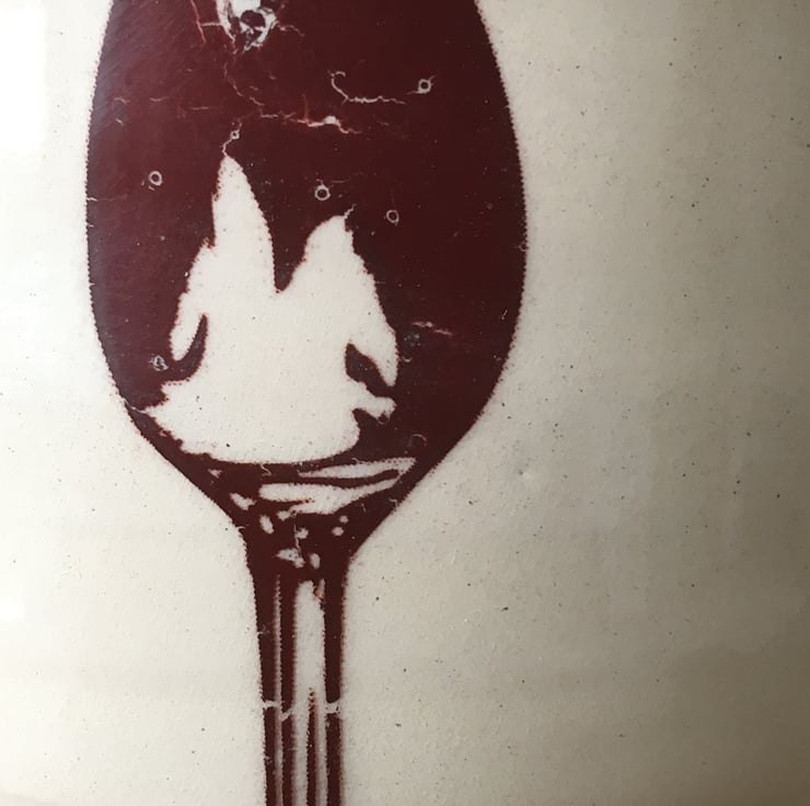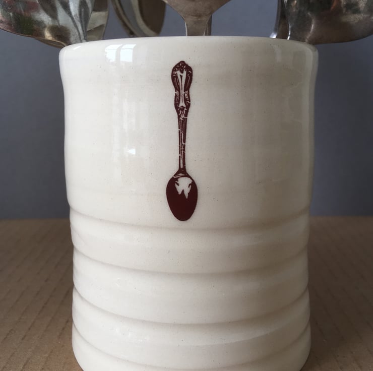 The decal graphics are a rich brown colour. One side of the pot has a large spoon which lies opposite a small spoon graphic.