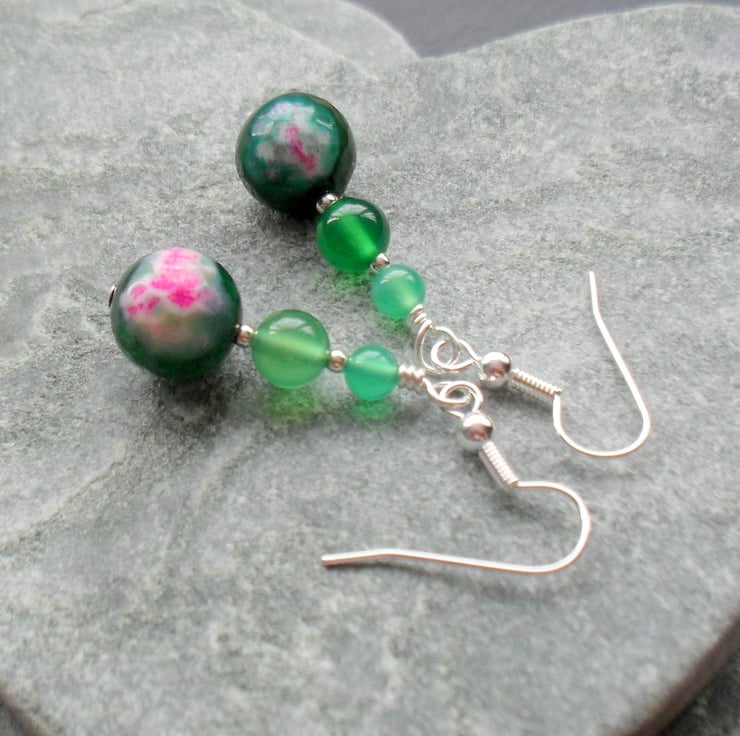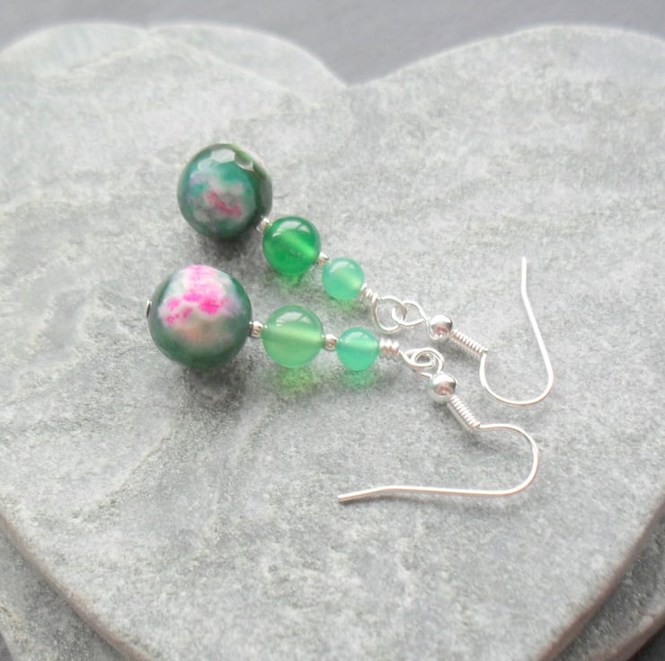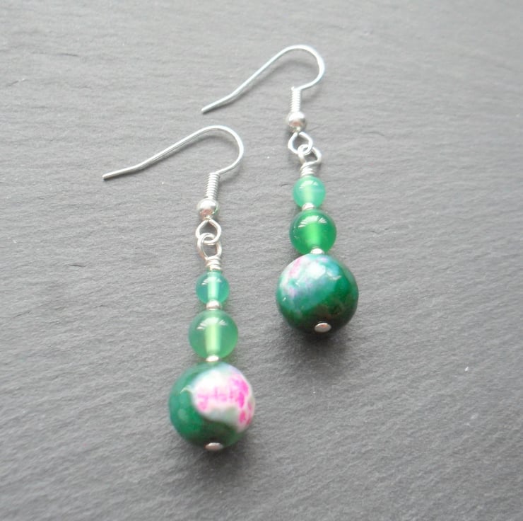 Green and pink agate dyed semi precious gemstones with silver plated beads are attached to silver plated ear wires