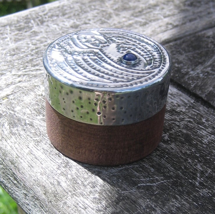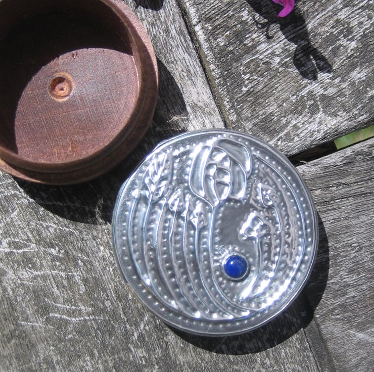 Tiny jewellery or ring box in wood an silver pewter, inspired by Charles Rennie Mackintosh and made in the Arts and Crafts tradition. In a rose design and set with a blue lapis lazuli gemstone cabochon. This little rustic wooden box has been transformed with a handmade silver pewter lid. Measuring just 29mm in height and 39mm in diameter, this little box would be perfect for storing a ring, earrings,cufflinks or other tiny treasures. An ideal gift for a woman or man.