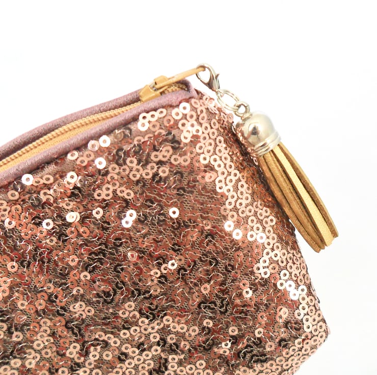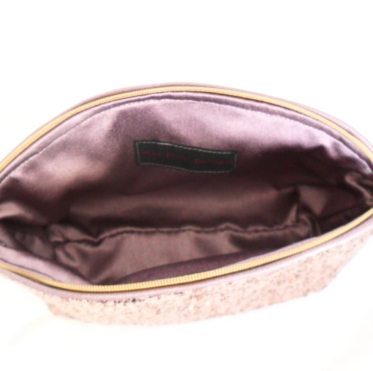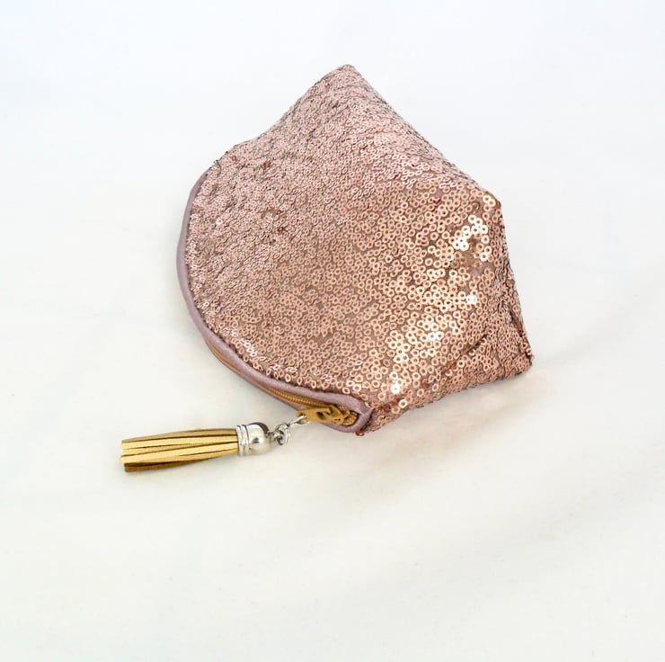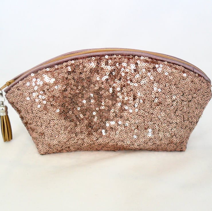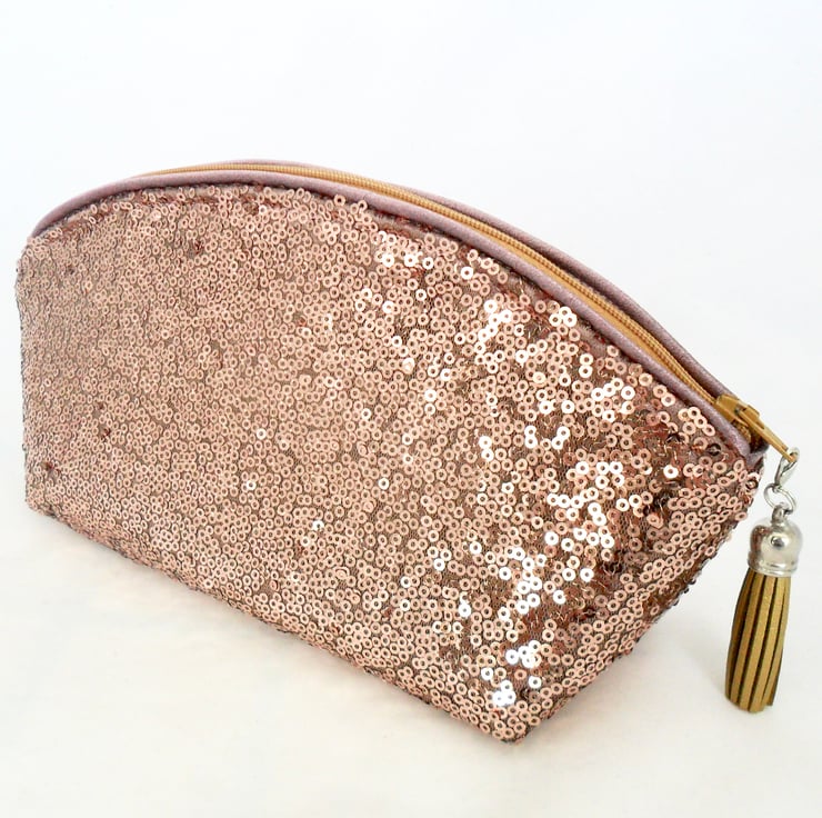 Handmade in mauve satin with a rose gold sequin overlay, this cosmetics bag is also lined in the same satin. The lightweight foam interlining gives the bag enough stability to stand alone even when empty, and allows easy access to your makeup, or whatever else you choose to put in it! The finishing touch is a gold coloured zip complete with a faux leather tassel trim.