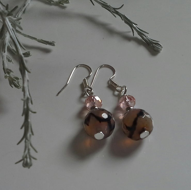 Asweet feminine pair of earrings designed and hand crafted using rare snakeskin 6 mm round cut agate gemstones complimented with peach colour faceted rondelle cut crystal beads. The earrings have been constructed using all quality silver plated components which are nickel free.