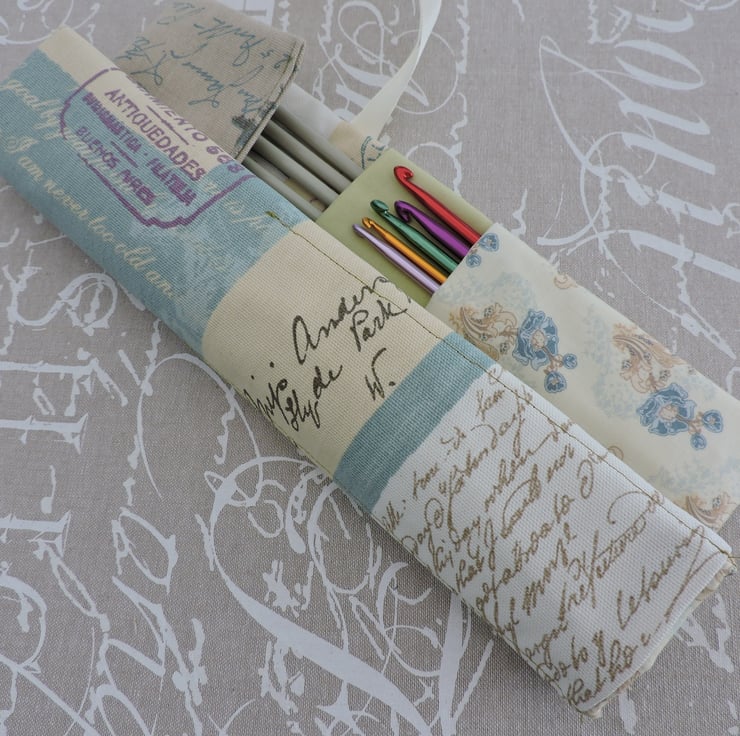 This handy knitting needle and crochet hook roll has been made with a cotton duck fabric depicting random script and postage stamps in a sage, cream and dusky flax blue for the outer and inner of the roll. The double layer cotton fabric pockets which have four divisions in each layer have been made with one in plain pale sage green the other in a cream and blue floral pattern. The divisions are large enough to hold a number of needles, crochet hooks, scissors, tape measures etc.
