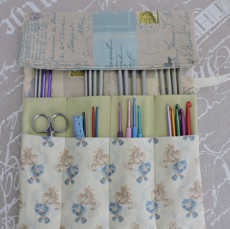 This handy knitting needle and crochet hook roll has been made with a cotton duck fabric depicting random script and postage stamps in a sage, cream and dusky flax blue for the outer and inner of the roll. The double layer cotton fabric pockets which have four divisions in each layer have been made with one in plain pale sage green the other in a cream and blue floral pattern. The divisions are large enough to hold a number of needles, crochet hooks, scissors, tape measures etc.