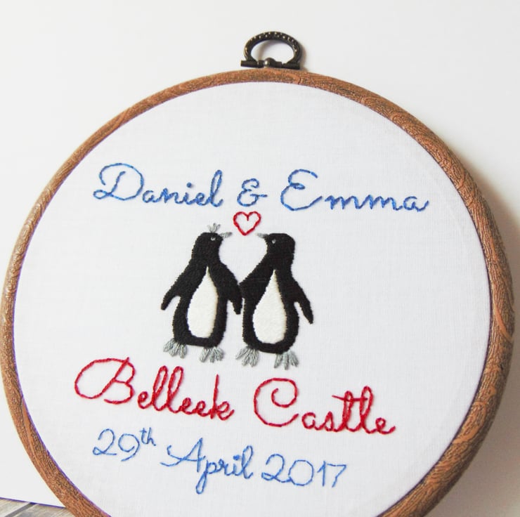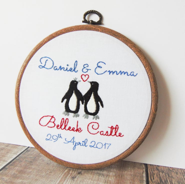 It features two cute black and white penguins with a heart and any text you would like, in any colours! The perfect gift for any anniversary but especially cotton which is 2 years. These are hand sewn to order, set in a six inch hoop and include ribbon.