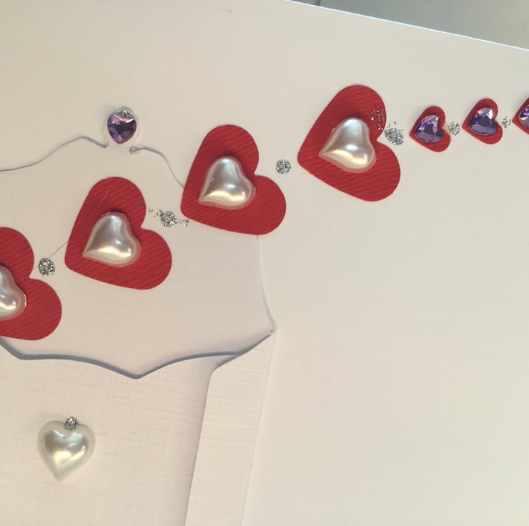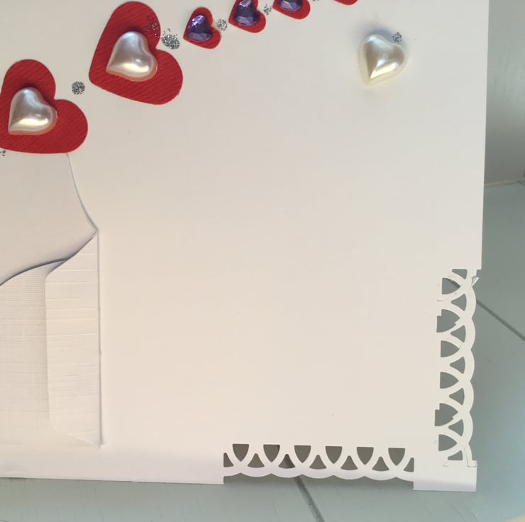 The white card adorned with cut out hearts and faux pearl hearts and spots of glitter. A cut out corner gives a detailed effect