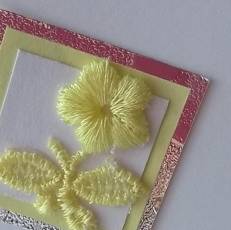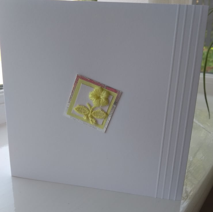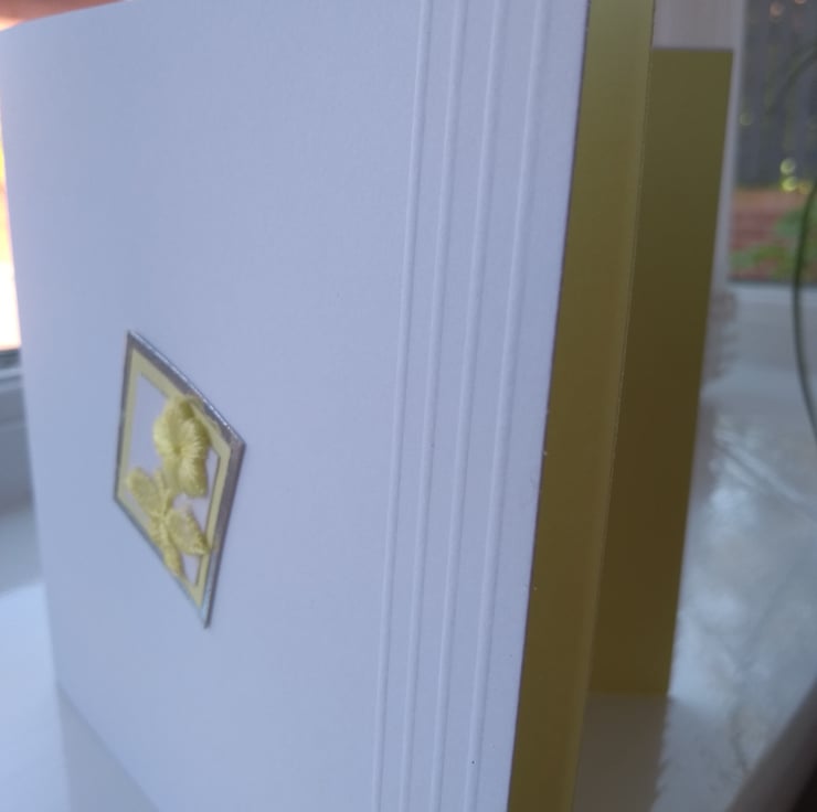 A completely handmade and uniquely designed card. Consisting of quality pristine white y which had four lines embossed on the right border. In the centre is a pretty yellow cotton flower which has been mounted onto white card, yellow card then silver mirror card.