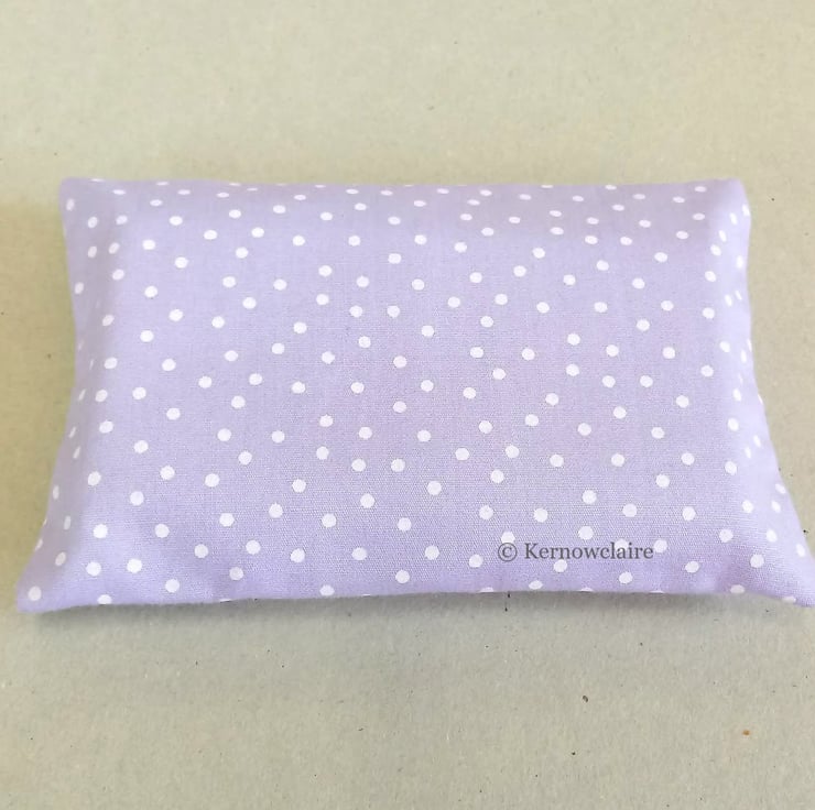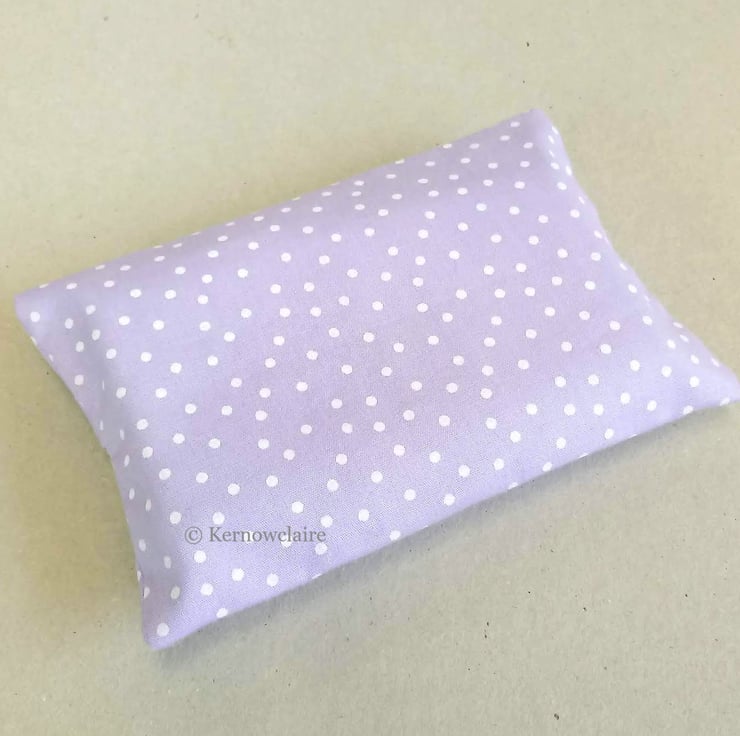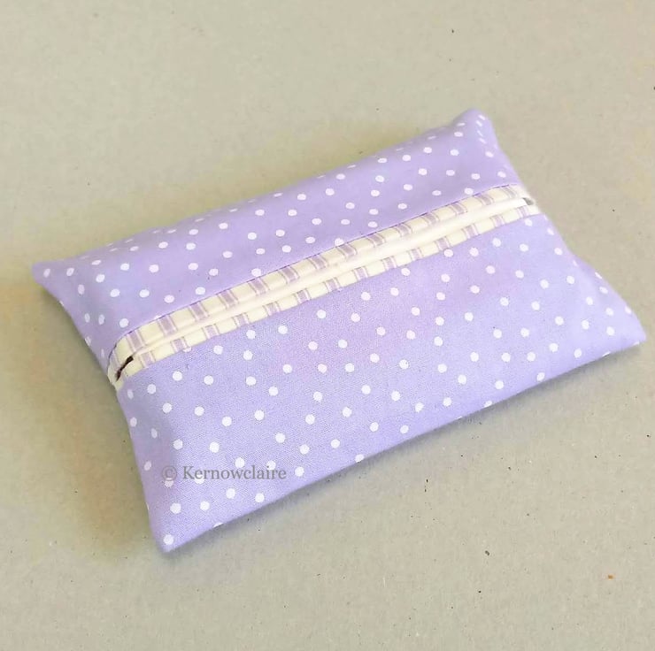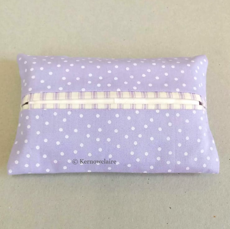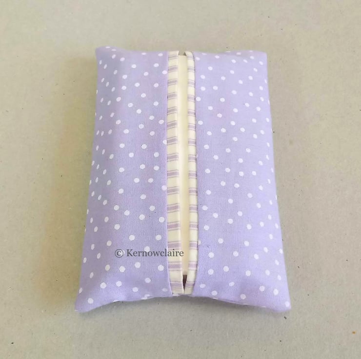 This is a lovely pocket tissue holder, handmade in cotton fabrics. The outside is light purple with white spots and the lining is white with purple stripes - this can also be seen on the outside edges. It measures approx - 8.5 cm x 12.5 cm (3 1/4 inches x 5 inches)