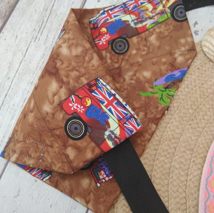 A fun dog bandana in a British theme with Camper van design on a muddy brown background. Made with easy care poly cotton. It is a slip collar through design. And is double sided. Great little addition to your dogs wardrobe.