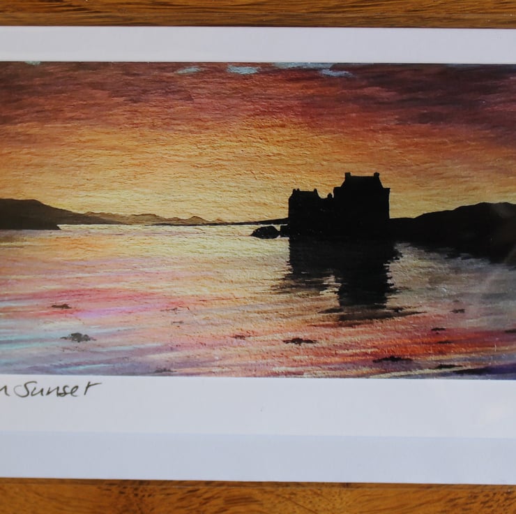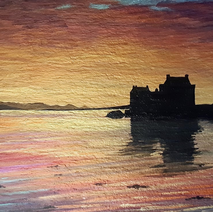 My high school best friend lived in Dornie, so I spent a lot of time as a teenager exploring around the castle. She inspired me to paint the original slate of this. There are many images of Eilean Donan, but I have always loved the castle silhouetted against a beautiful Highland sunset.