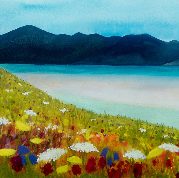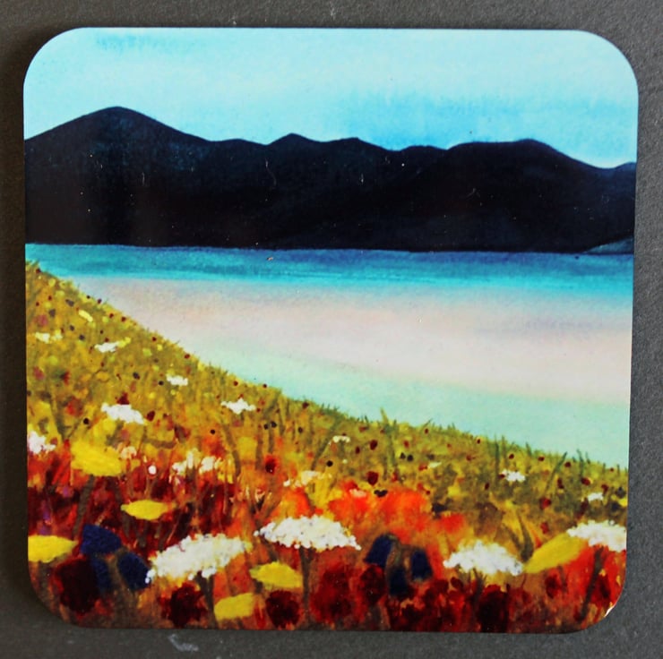 I painted the original in 2015 after a family trip to the Hebrides. I love it up there - wild, isolated, big skies. And the white sandy beaches are incredible, whatever the weather. I also love how the wild flowers run down to the beaches - full of colour and the sound of bees. The collective name for these flowers is "machair"! This was one of my first four coaster designs.