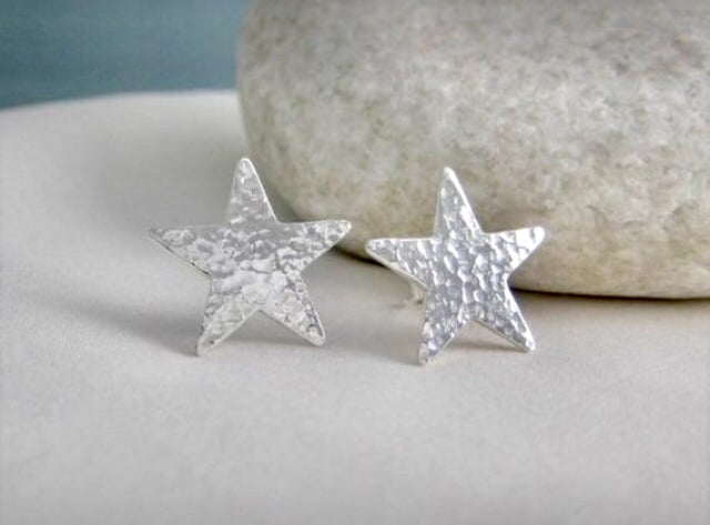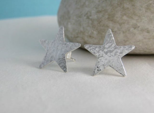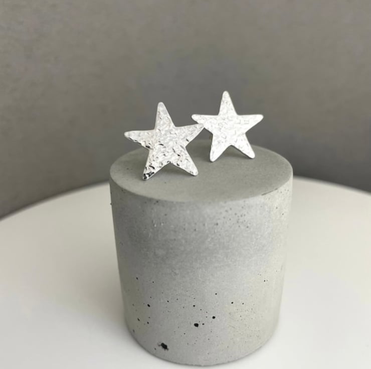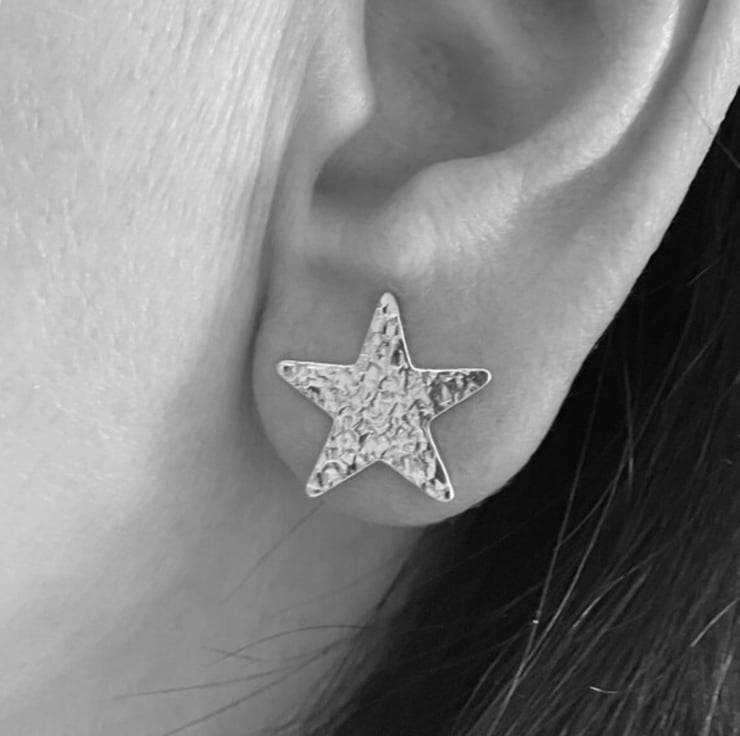 A lovely pair of star ear stud earrings handmade from 925 sterling silver. Cut out by hand from solid 1mm thick silver sheet then hammered to create their unique sparkly textured surface. They have long silver pin fittings in the centre and secured with stamped (925) silver scroll’s/butterfly’s. Finished off with a high polished shine.