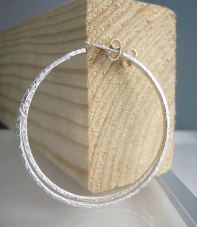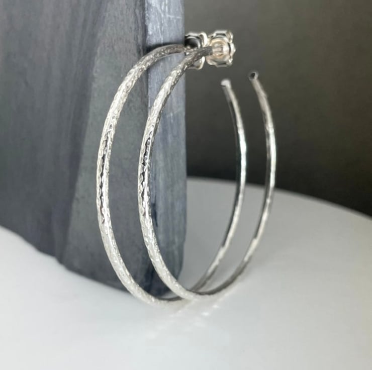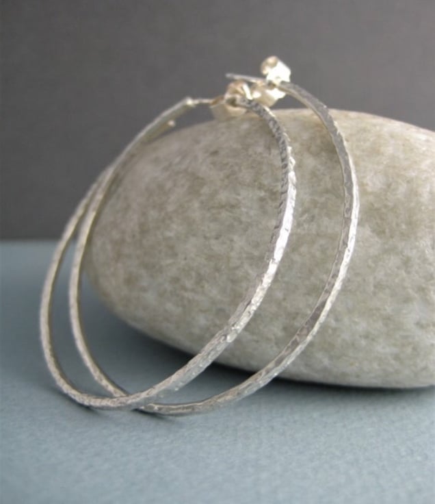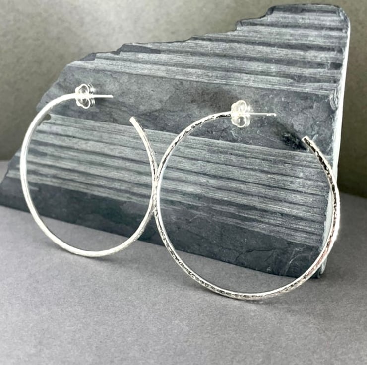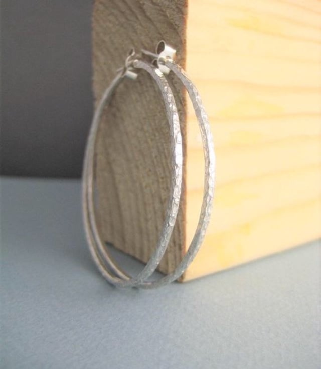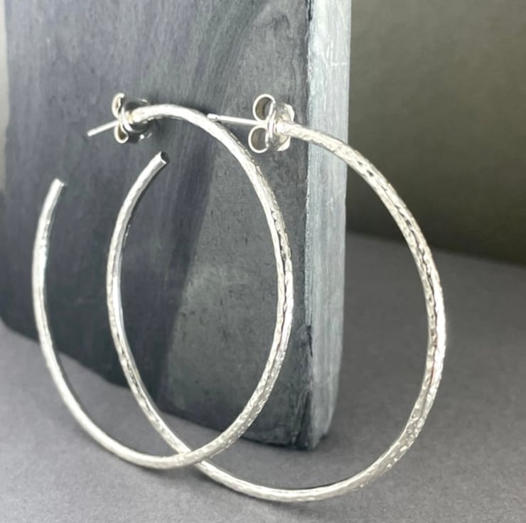 A lovely pair of classic hoop earrings handmade from 925 sterling silver. Cut by hand from solid 2mm thick silver round wire, formed into circular shapes then hammered to create their unique attractive sparkly textured surface. They have long silver pins and secured with stamped (925) silver scroll’s /butterfly’s.