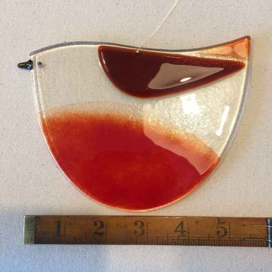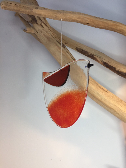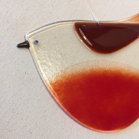 Kiln forming is a process where glass is layered heated in a kiln to a temperature where the glass melts and the layers fuse together. I use glass sheet and glass powder to make my birds. They have been digitally annealed and cooled for strength and safety in my studio in Bristol.