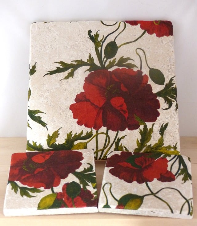A 20cm square natural stone table mat and two matching coasters measuring 10cm square decoupaged with a dark red poppy paper napkin. All items have cork backs to protect your furniture and have been coated with lacquer so they can be wiped with a damp cloth (do not immerse in water). The table mat would make a lovely centrepiece on your table, can be used as a teapot stand or just to display in your room.An ideal gift for family or friends.