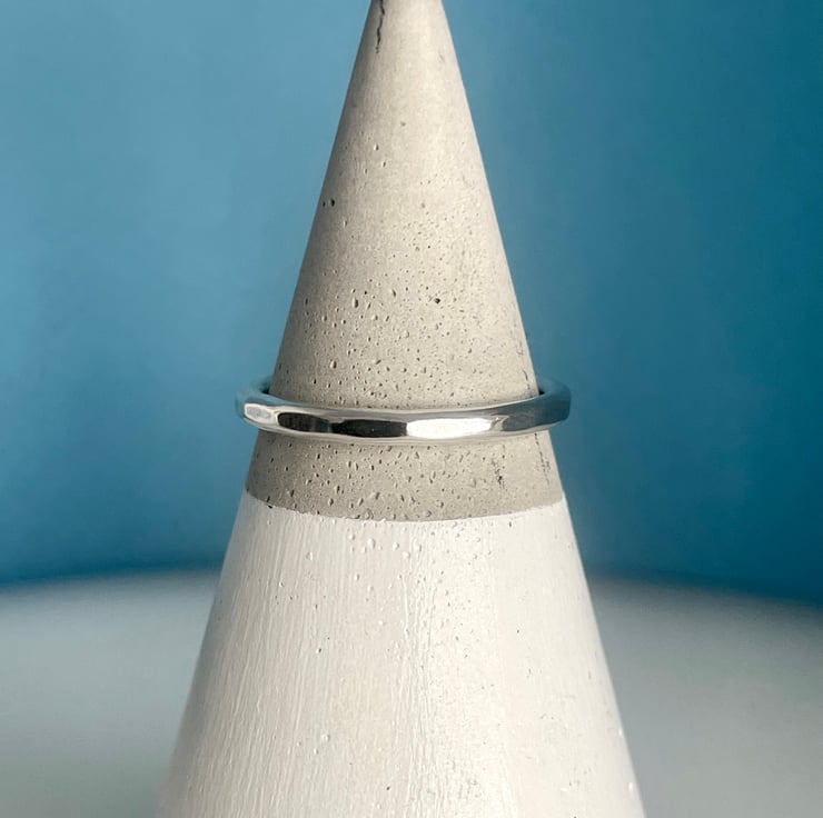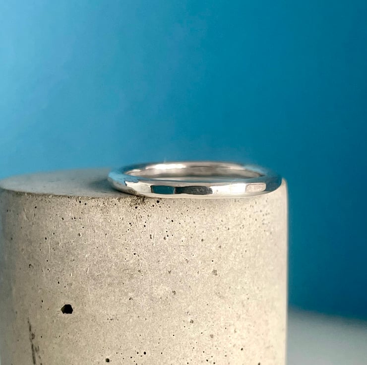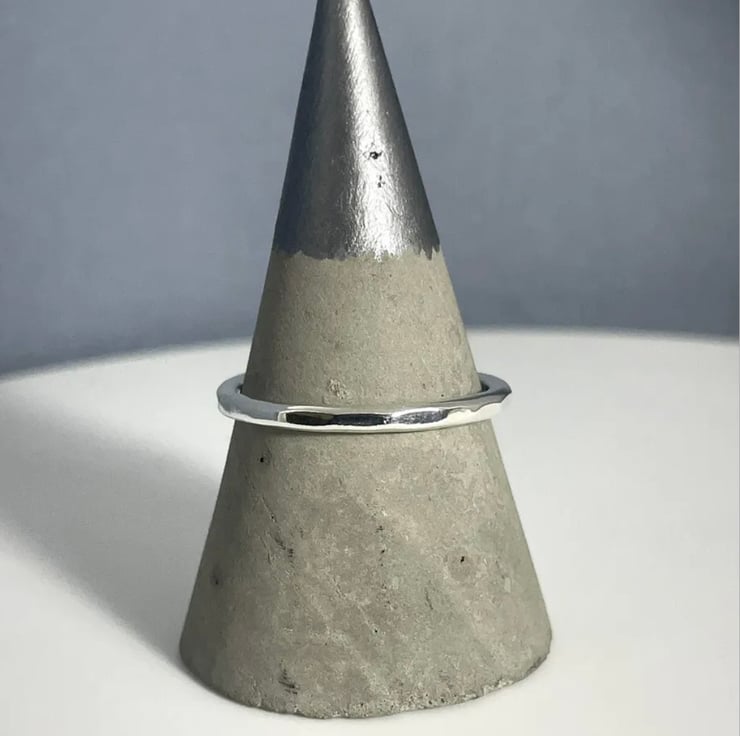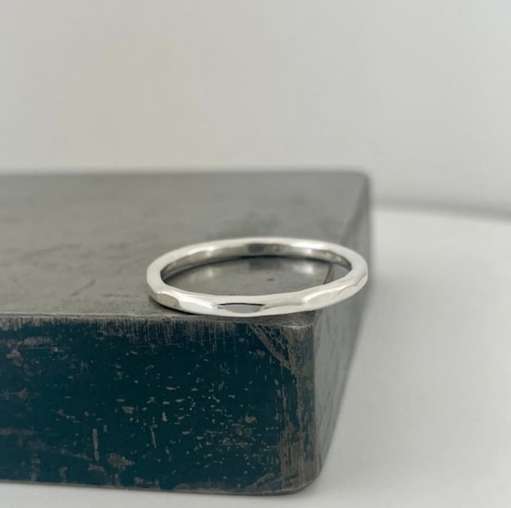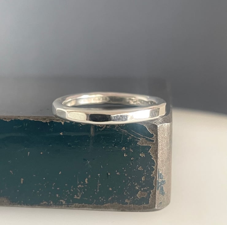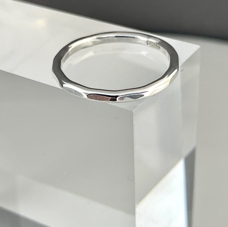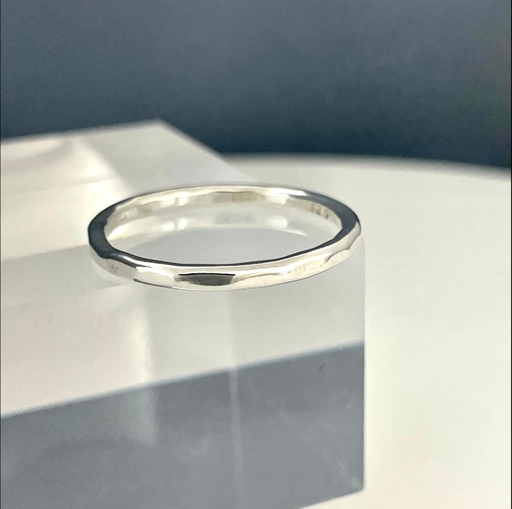 A lovely stacking ring handmade from 925 sterling silver. Cut by hand from solid 2mm thick silver round wire, formed into a ring then hammered to create it’s unique faceted textured surface.