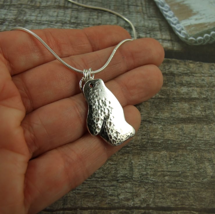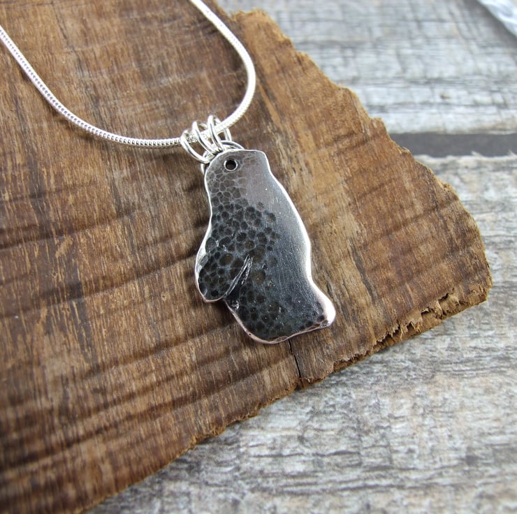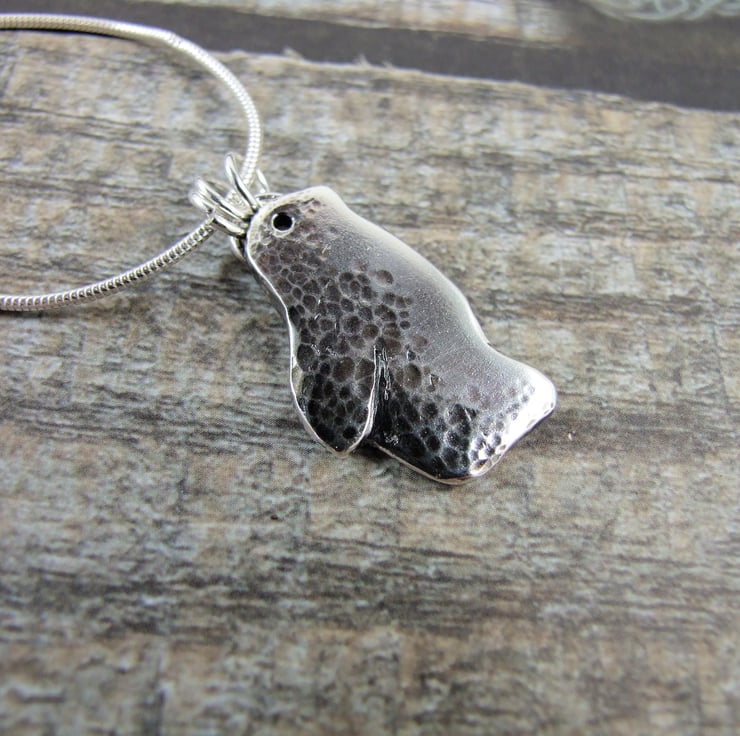 I have created the penguin from recycled molten sterling silver which I have cast in carbon and hammered for a textured effect then oxidised to add a patina. Fitted to 18 inch .925 Sterling Silver Chain.
