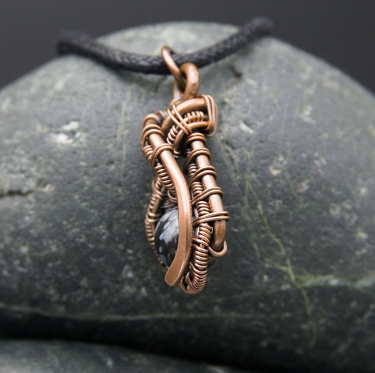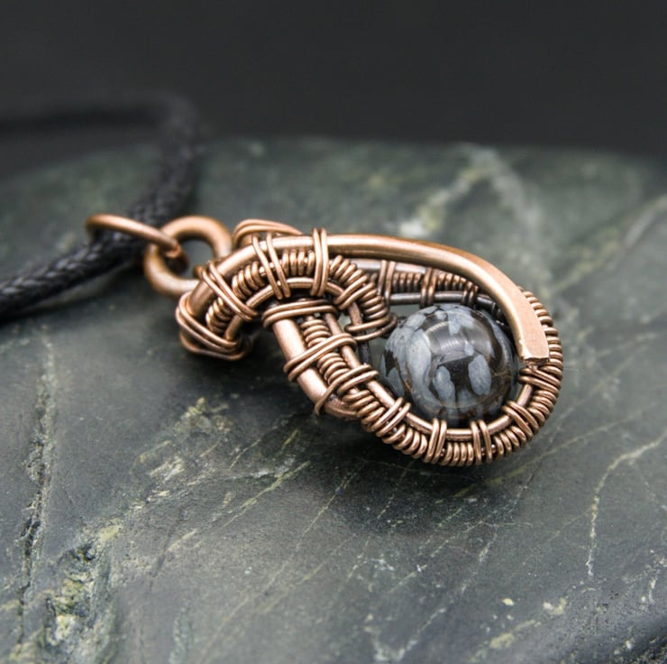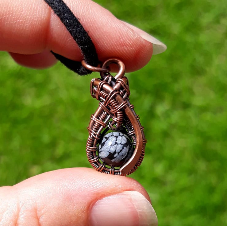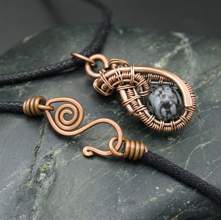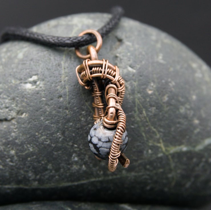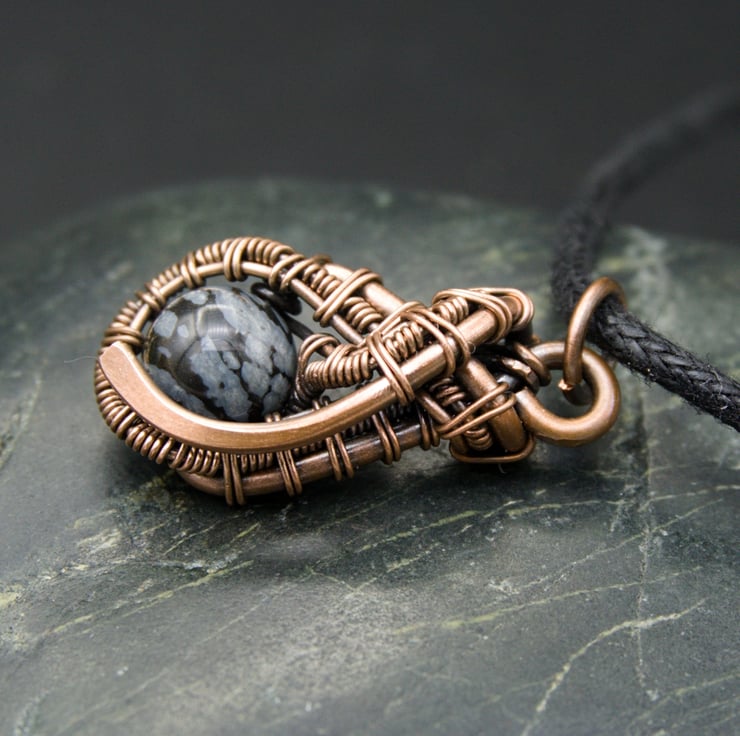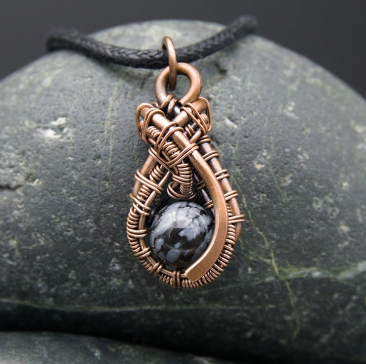 This cute little pendant features an 8mm round Snowflake Obsidian bead - a pretty black stone with white / grey mottling. I created a teardrop shape with thick copper wire as a frame, & then wove finer wire within it to loop around the bead, finishing with a hammered curve. This pendant is one of a kind - it's small & understated whilst still being interesting & unique.