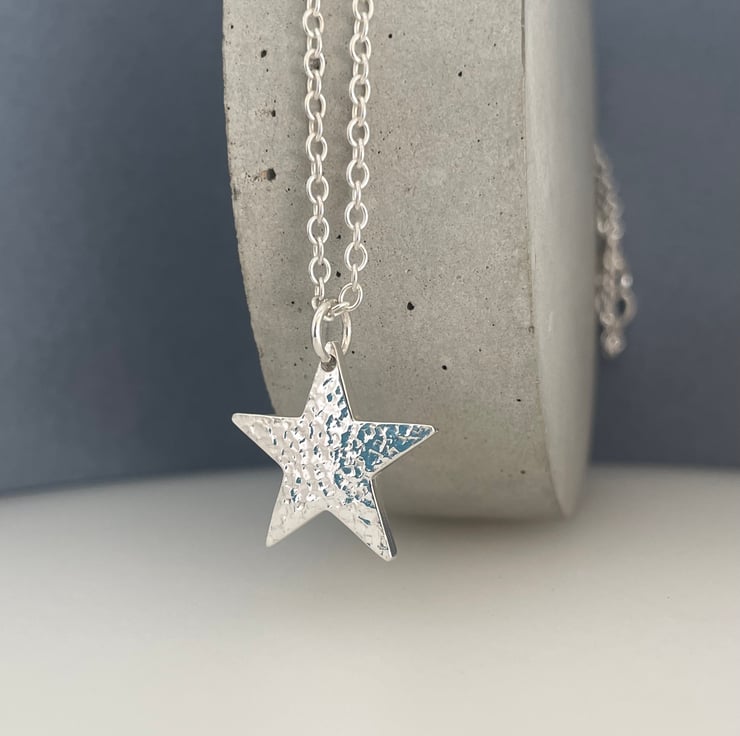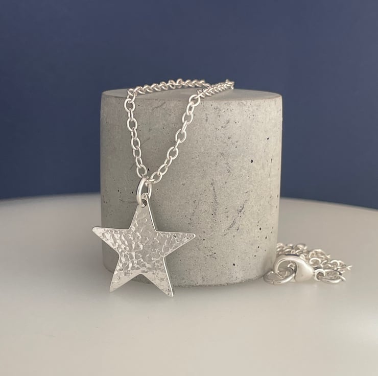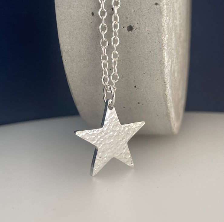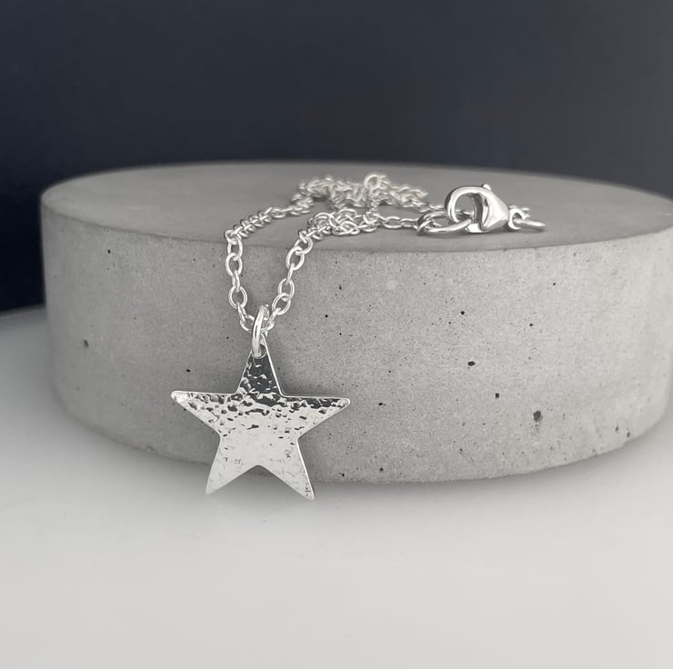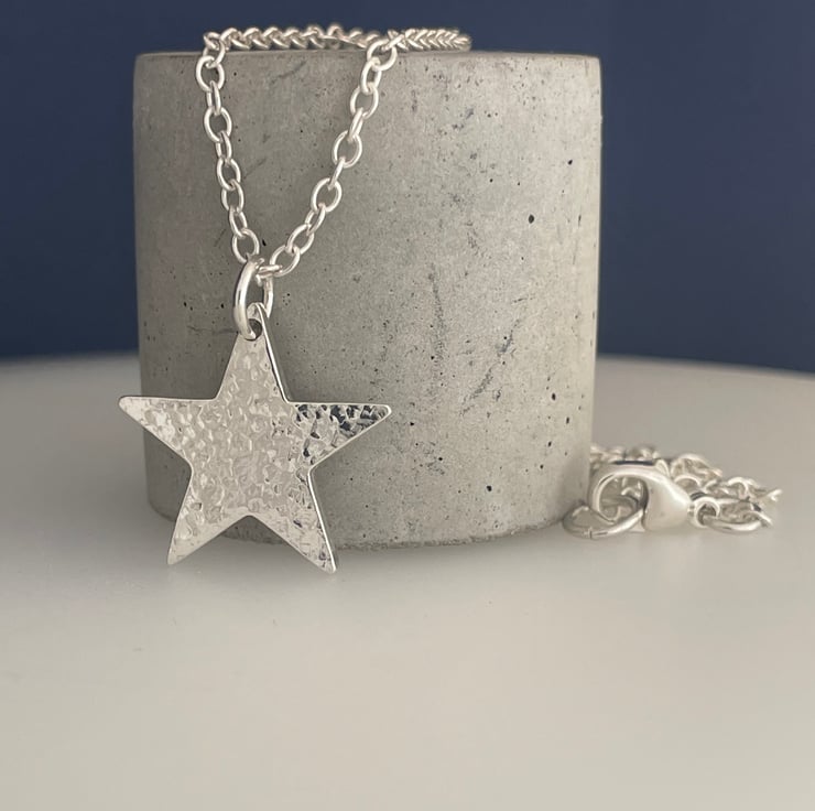A lovely star pendant necklace handmade from 925 sterling silver. Cut out by hand from solid 1.8mm thick silver then hammered to create a unique sparkly textured surface. Hung onto Trace chain along with silver trigger clasp as it’s fastening.