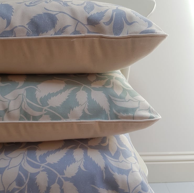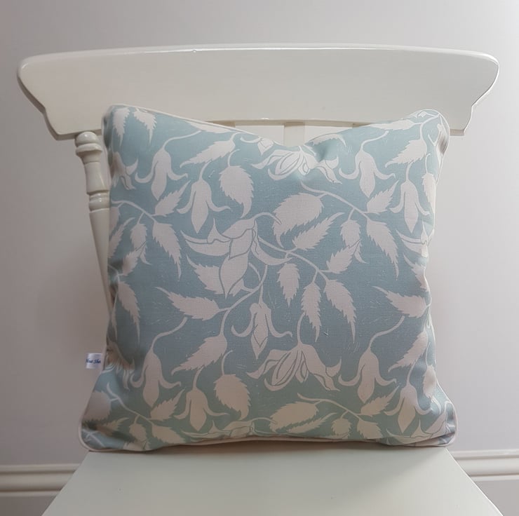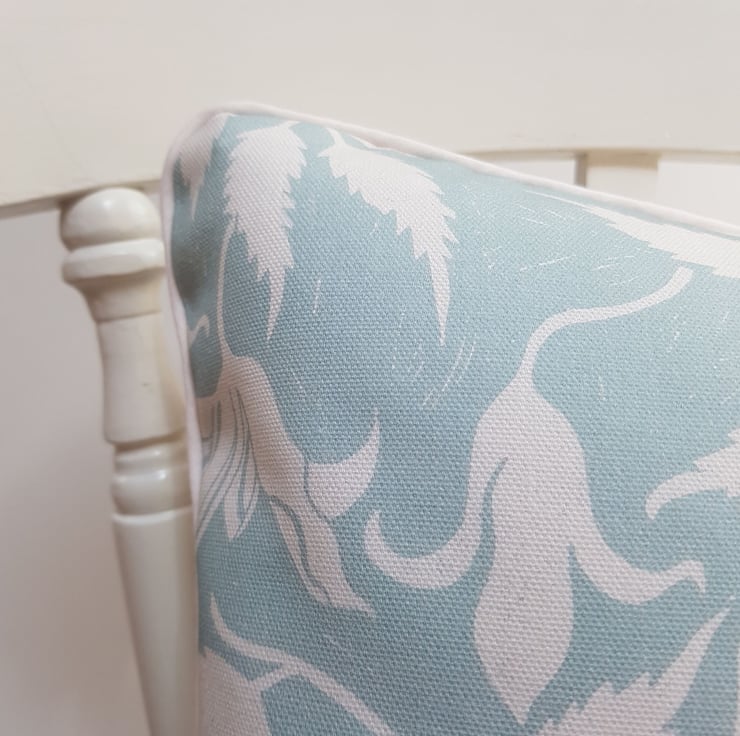 A pretty and fresh cushion made in my green Alpina fabric. This cushion measures approximately 42cm x 42cm, has a cream piped edge and comes complete with a luxury feather insert. Calico backed with a velco fastening.