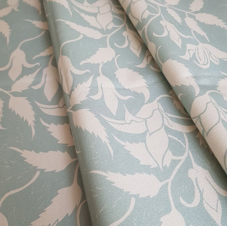 This fabric was inspired by the Clematis Alpina in my garden. Carved in lino, printed by hand and put into repeat before being printed digitally onto heavy cotton half panama.
