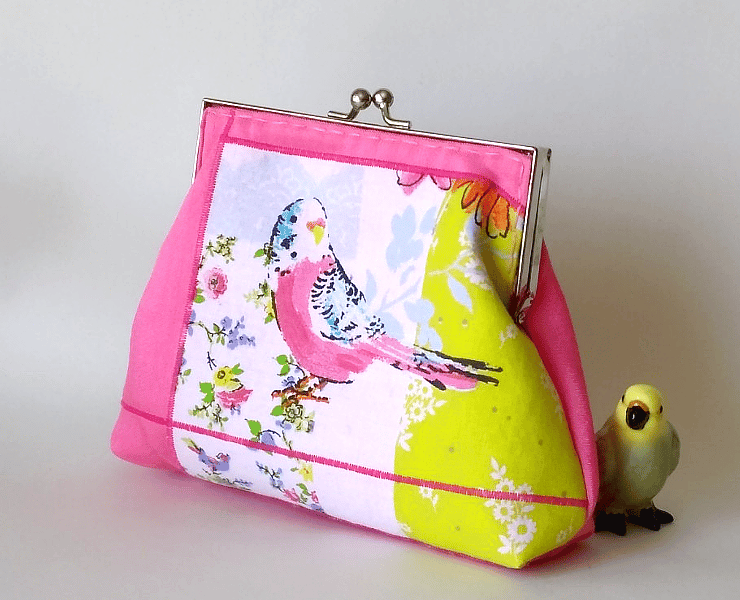 This is a very pretty clutch bag, with a pink budgerigar on the front. If you love birds and in particular budgies, and like feminine, vintage style items, this bag may be for you! The cute budgie is surrounded by cheerful shades of blue, green, yellow, orange and white, with a main colour of pink. The lining is plain pink.
