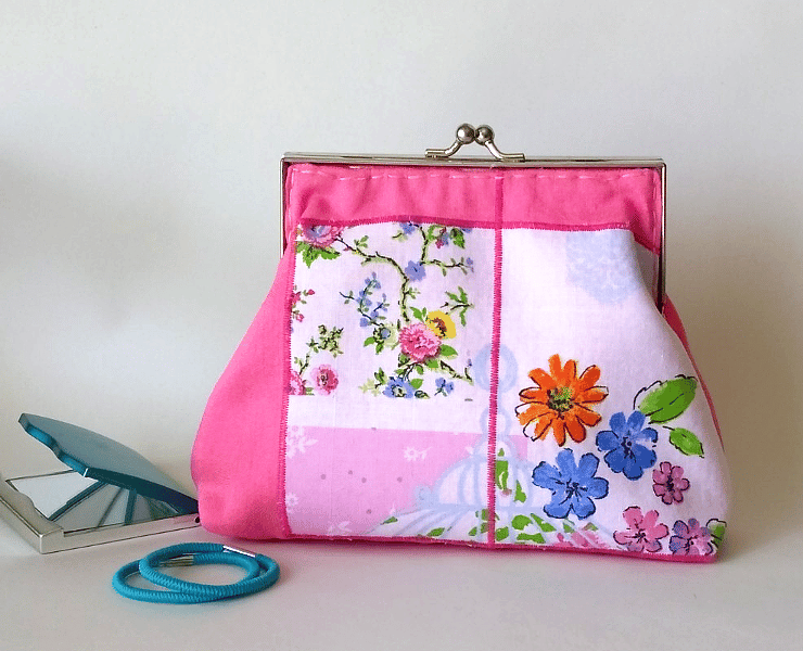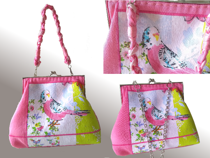 The silver metallic frame has a snap clasp opening. There are handy hideaway strap tabs to attach a handle. This bag comes with a handmade, shabby chic style, twisted, two-tone pink fabric strap that can be stowed away inside the body of the bag when not being used, or simply removed. A short silver chain strap can be purchased separately as an optional extra (click Choose Options button above) and is illustrated in the last photo, bottom right.