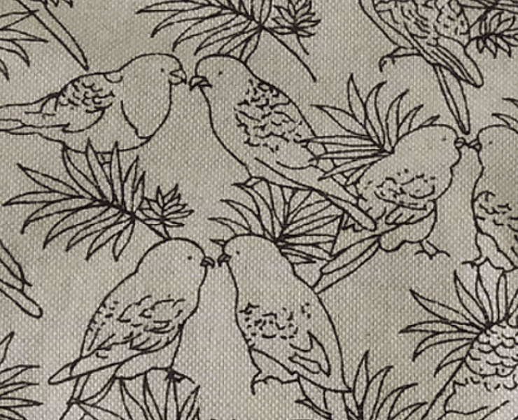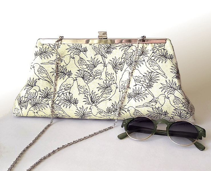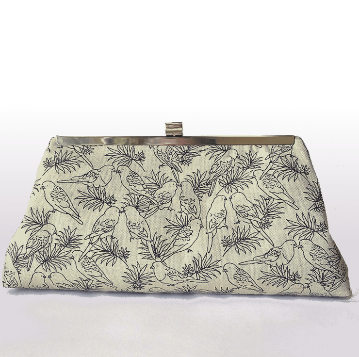 This is a stylish clutch bag with drawings of birds. If you love birds and in particular parrots, and like smart, vintage style items, this bag may be for you! The main fabric is a natural light beige colour and the birds are line drawings in black. The birds look generic, but they have hooked beaks which suggests they are from the parrot family.