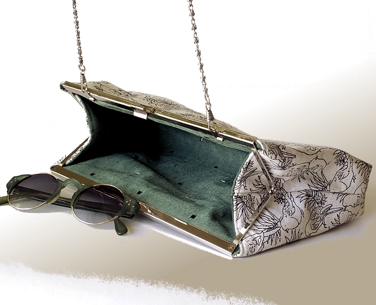 The silver metallic kiss clasp frame has a snap clasp opening. There are handy hideaway tabs to attach a secret chain strap. The chain strap is an optional extra (click Choose Options button above) and is illustrated in a couple of the photos.