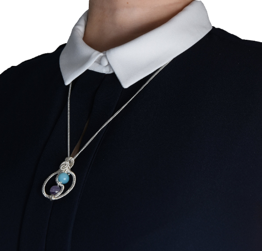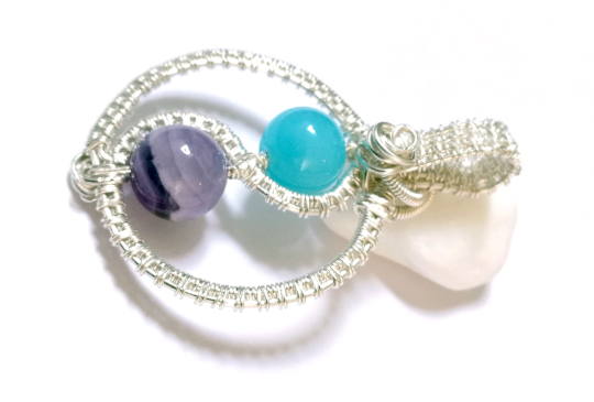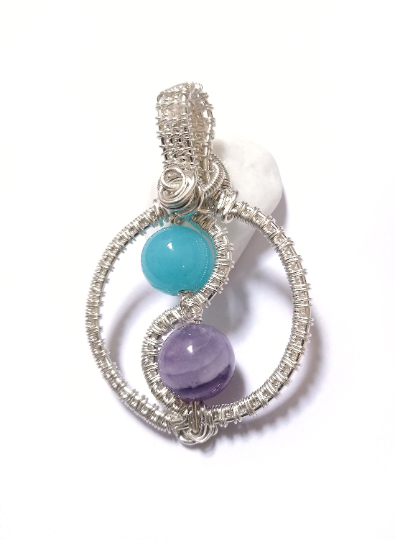 The amethyst and angelite beads have been wire weaved into the design to represent the ying-yang symbol.