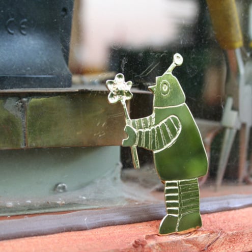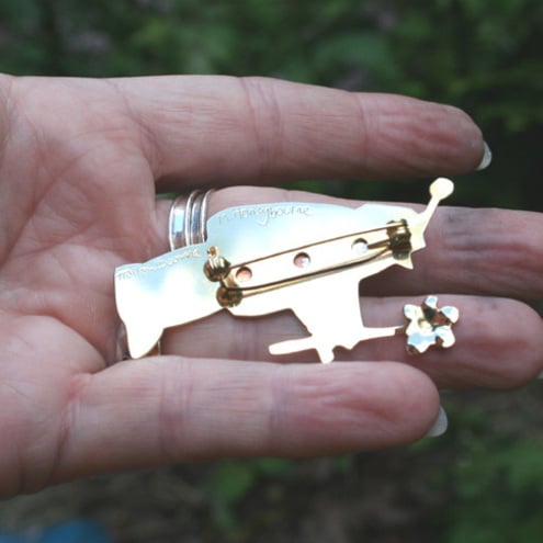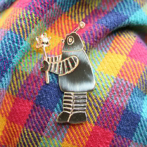 He has a safety catch firmly soldered to the back, is laquered and comes in a felt storage pouch.