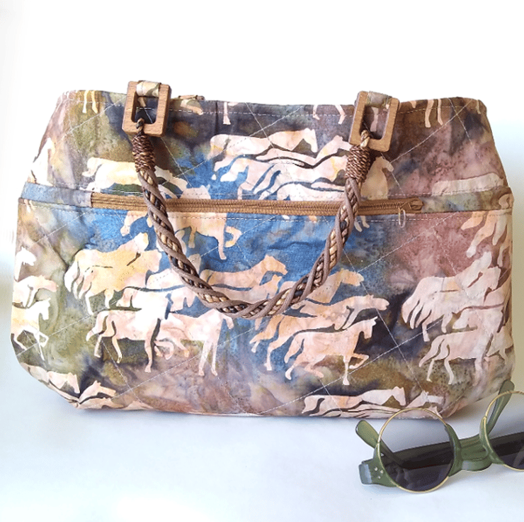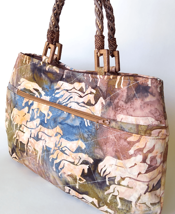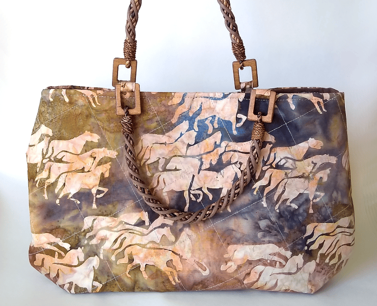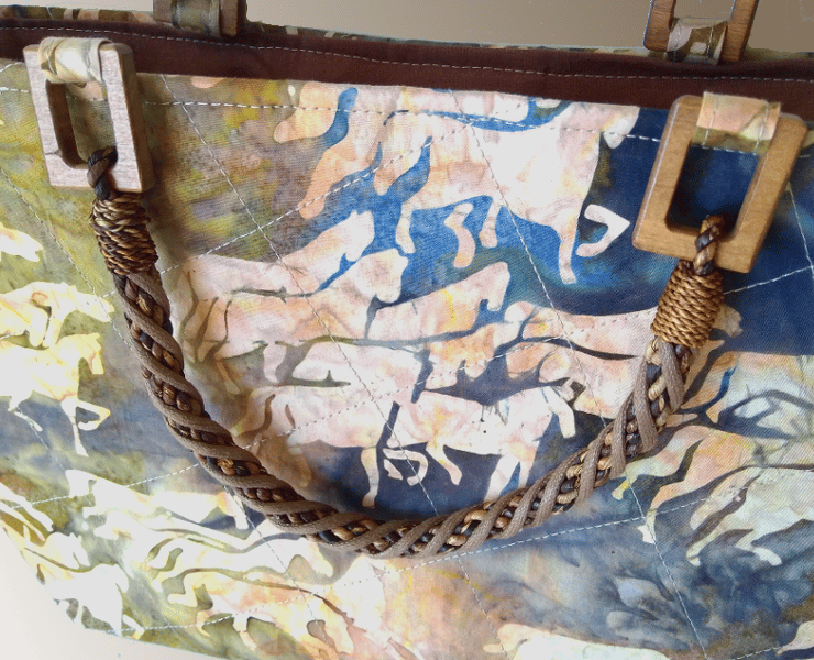 This is a stylish handbag with images of horses running across. The main fabric has swirling colours in shades of blue and brown, with impressions of horses in lighter brown tones.