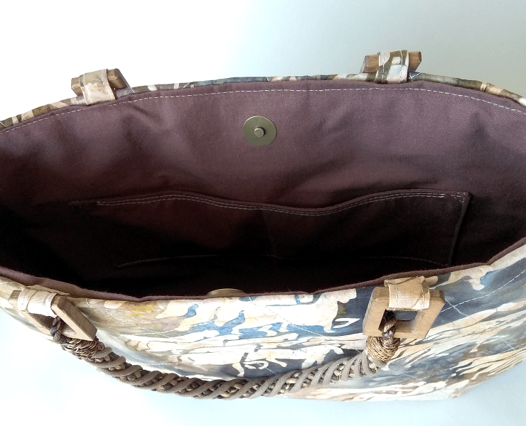 The handles are by Prym, and are made of dark-brown mixed, braided aback fibres, known for their high tensile strength. The material is reinforced by a brown, waxed cotton cord. They are connected to the bag by rectangular wooden loops.