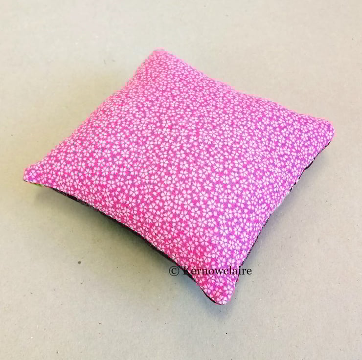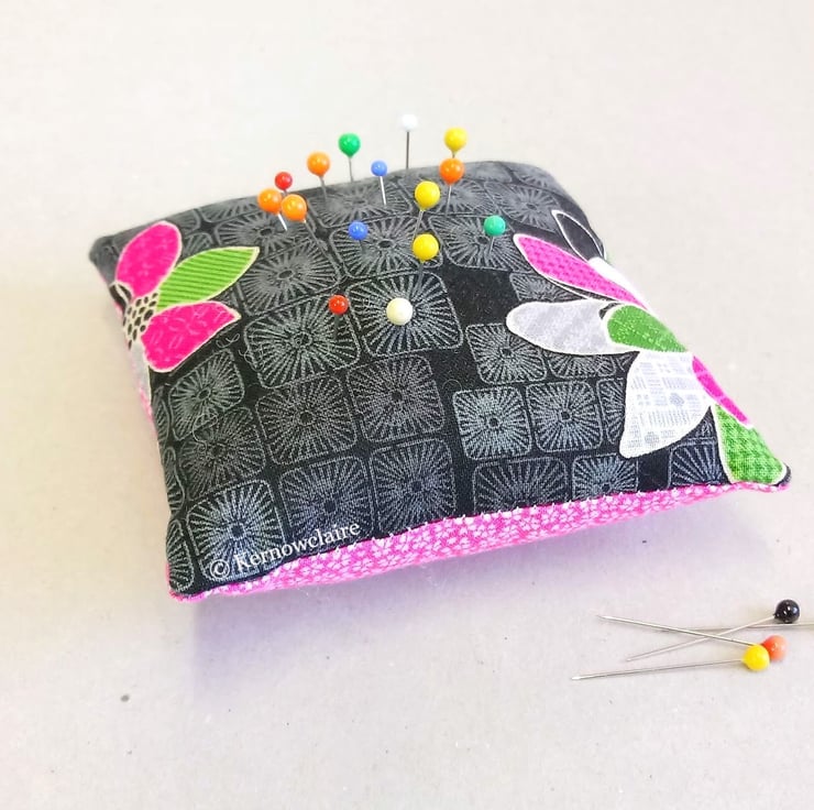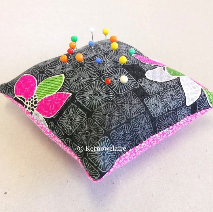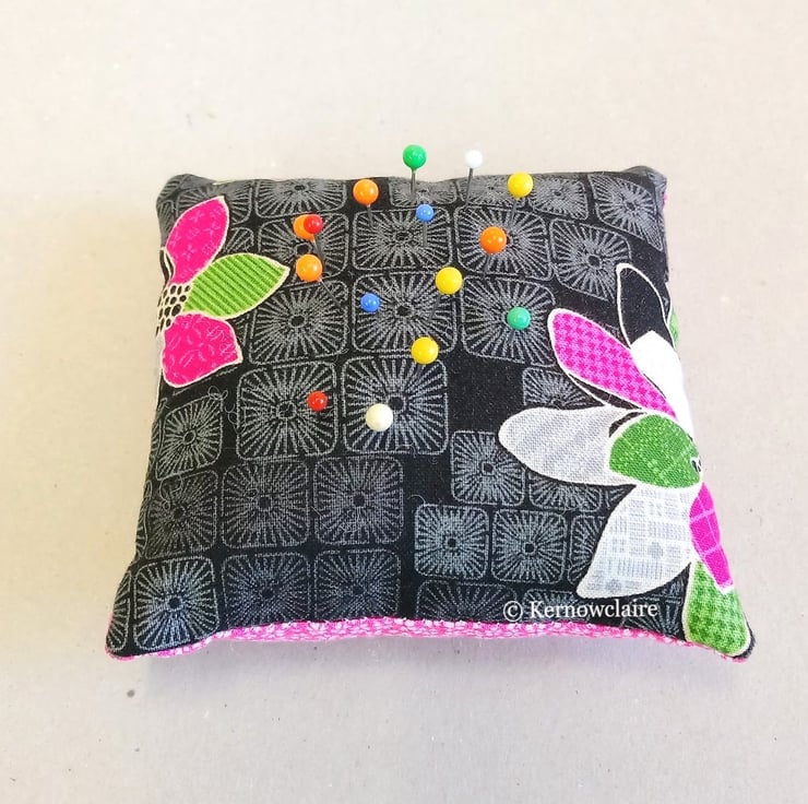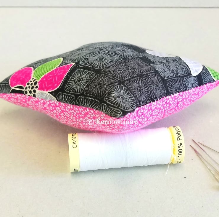This is a lovely pin cushion, handmade in cotton fabrics. It has a black and pink floral pattern on one side and a matching bright pink on the reverse. Perfect for keeping pins safe and organised. It measures approx - 9.5 cm x 9.5 cm (3 3/4 inches x 3 3/4 inches)