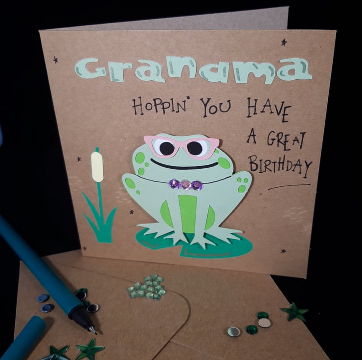 Featuring a large smiling frog, dressed in funky pink glasses and wearing a dazzling sparkly necklace, Gran is bound to giggle when she sees this funny card adorned with the words 'Hoppin' you have a great Birthday'.