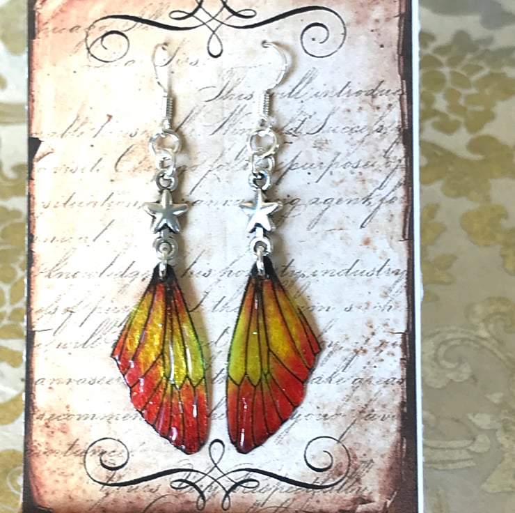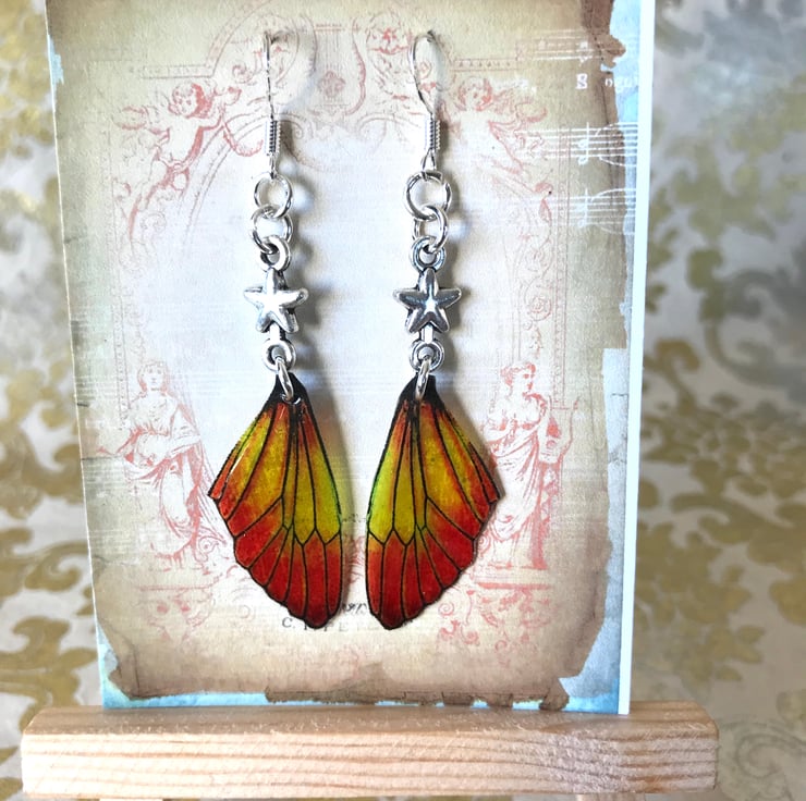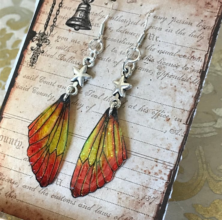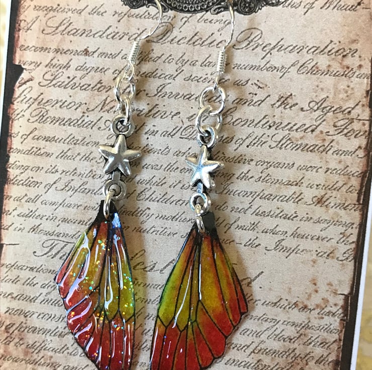 The golden yellow and orange earrings have such a beautiful sparkle. The iridescent fine glitter is captured beneath the surface of each wing and then glazed to add extra shine.