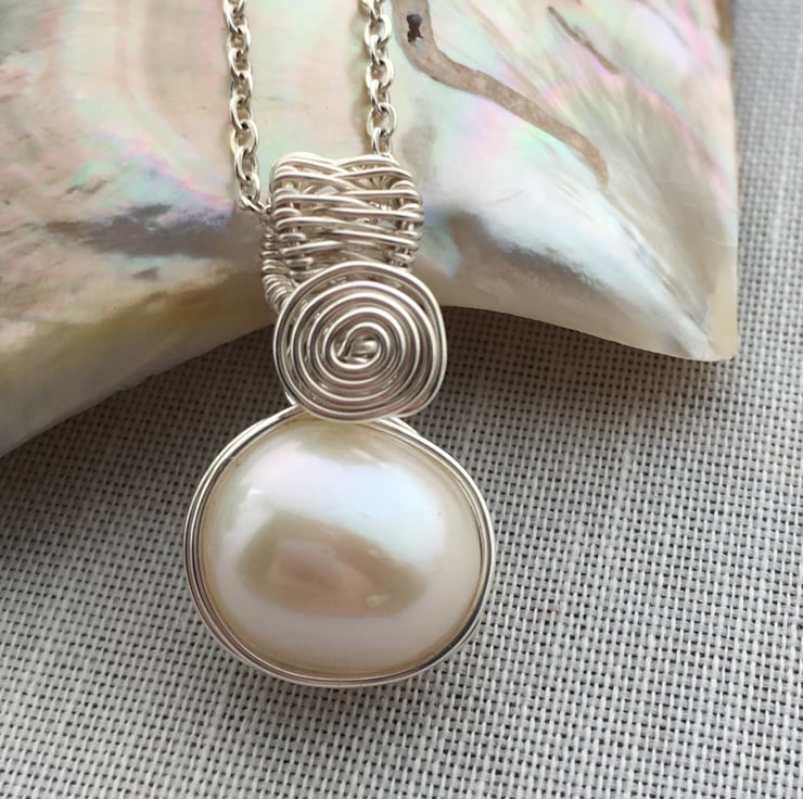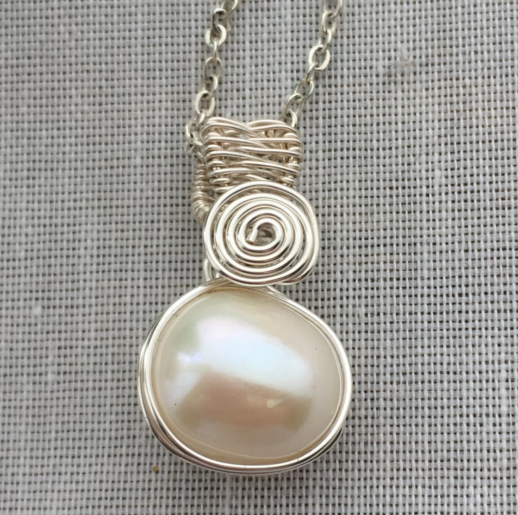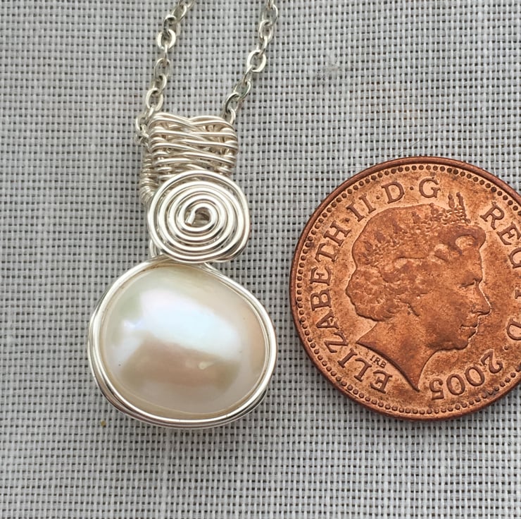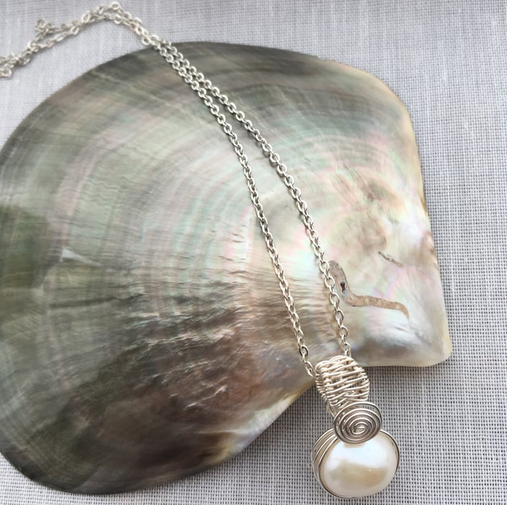 This beautifully creamy white 10mm oval freshwater pearl has been expertly and secured wrapped in tarnish resistant silver plated wire. This lovely pendant is suspended on a 20 inch silver plated chain.