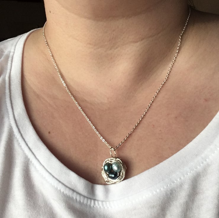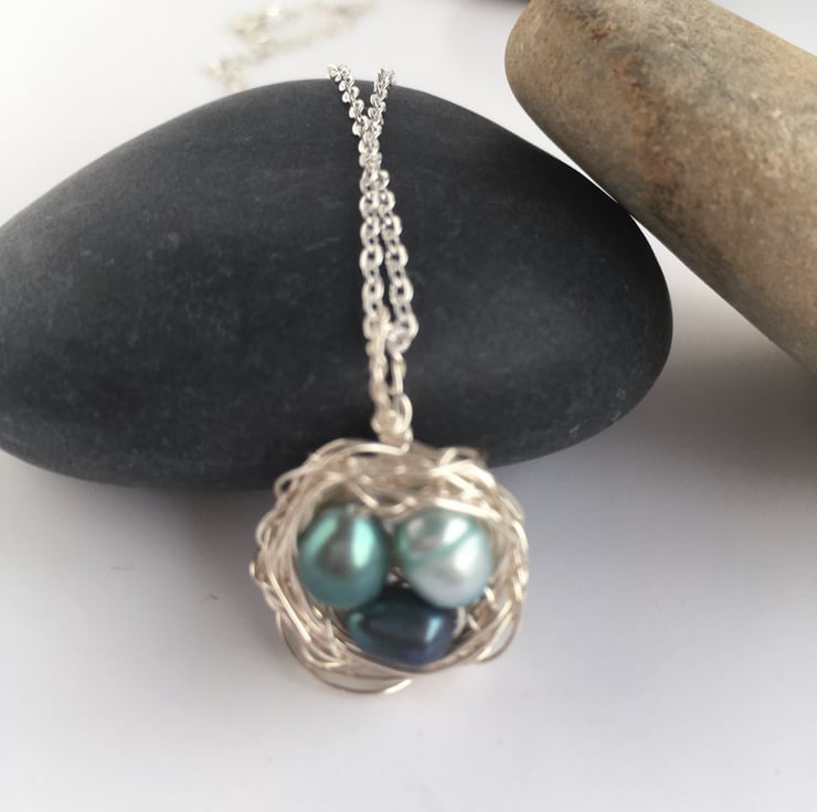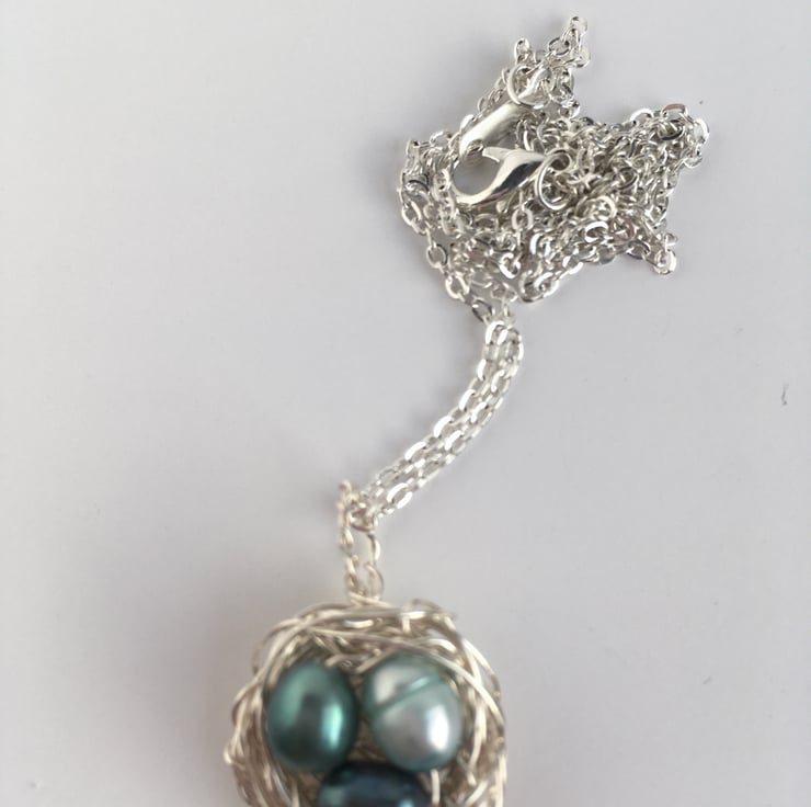 A fun little pendant modelled on a birds nest (of which there are a few in my garden). I have used pearls that have been dyed in shades of blue and teal, I think they look like the eggs of the Blue Jay.