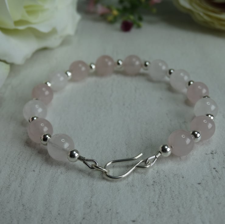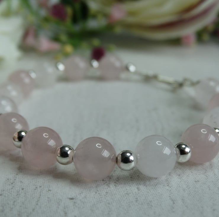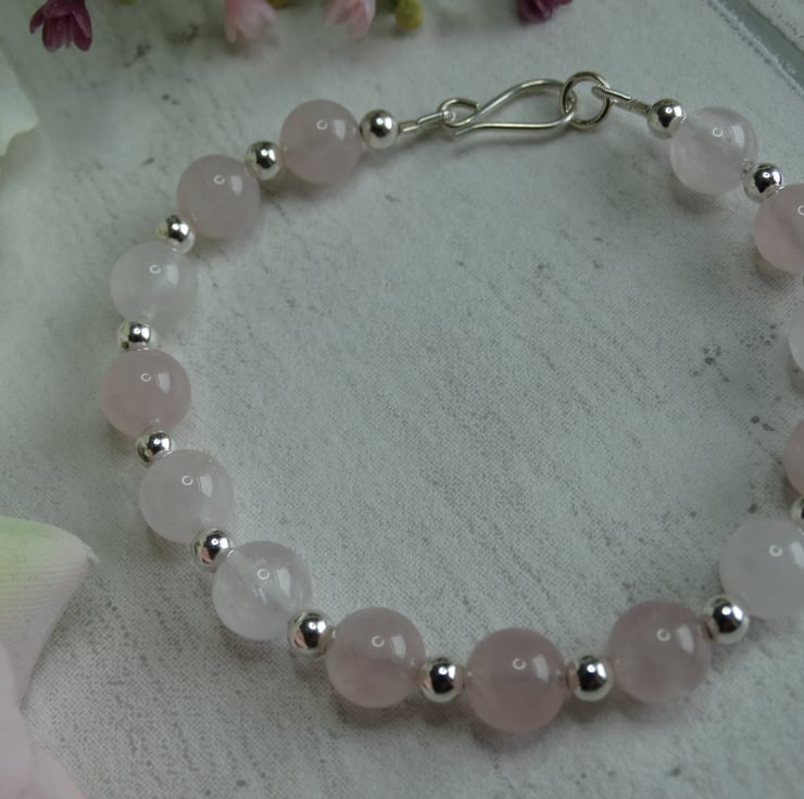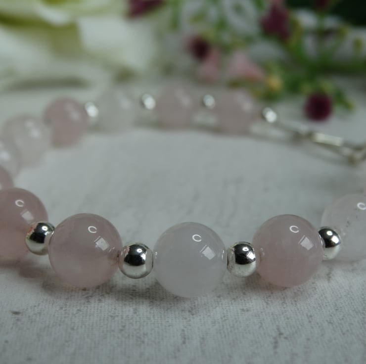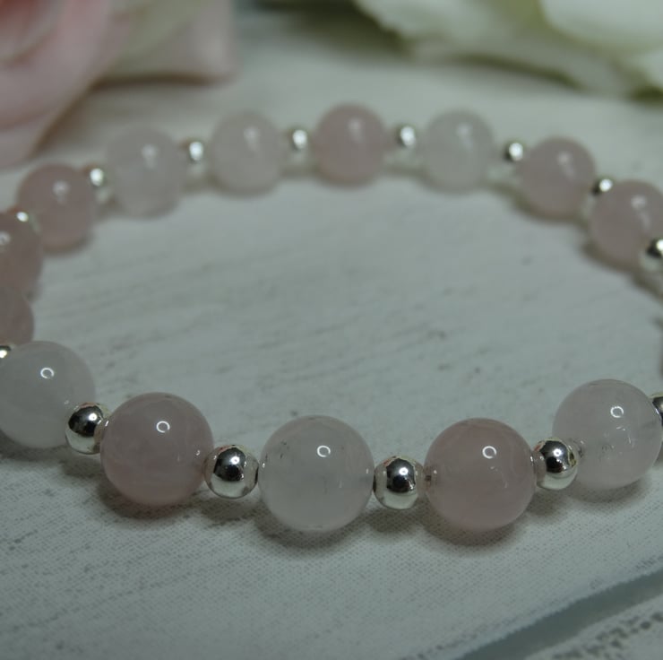 This bracelet is made from 8 mm rose quartz beads with 4 mm sterling silver beads in between them.