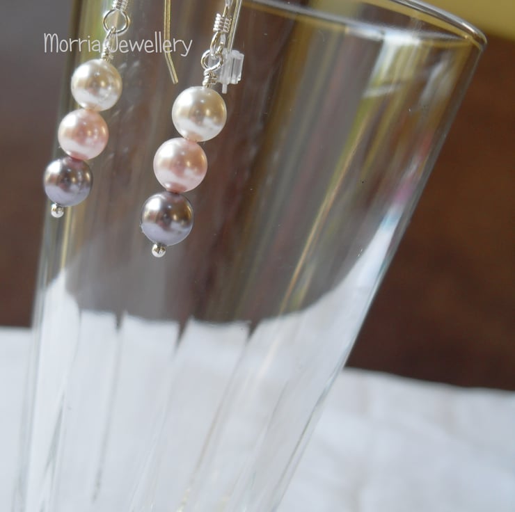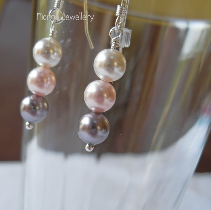 Drop earrings made with 3 6mm high end crystal pearls on each earring - one white, one pink and one mauve.